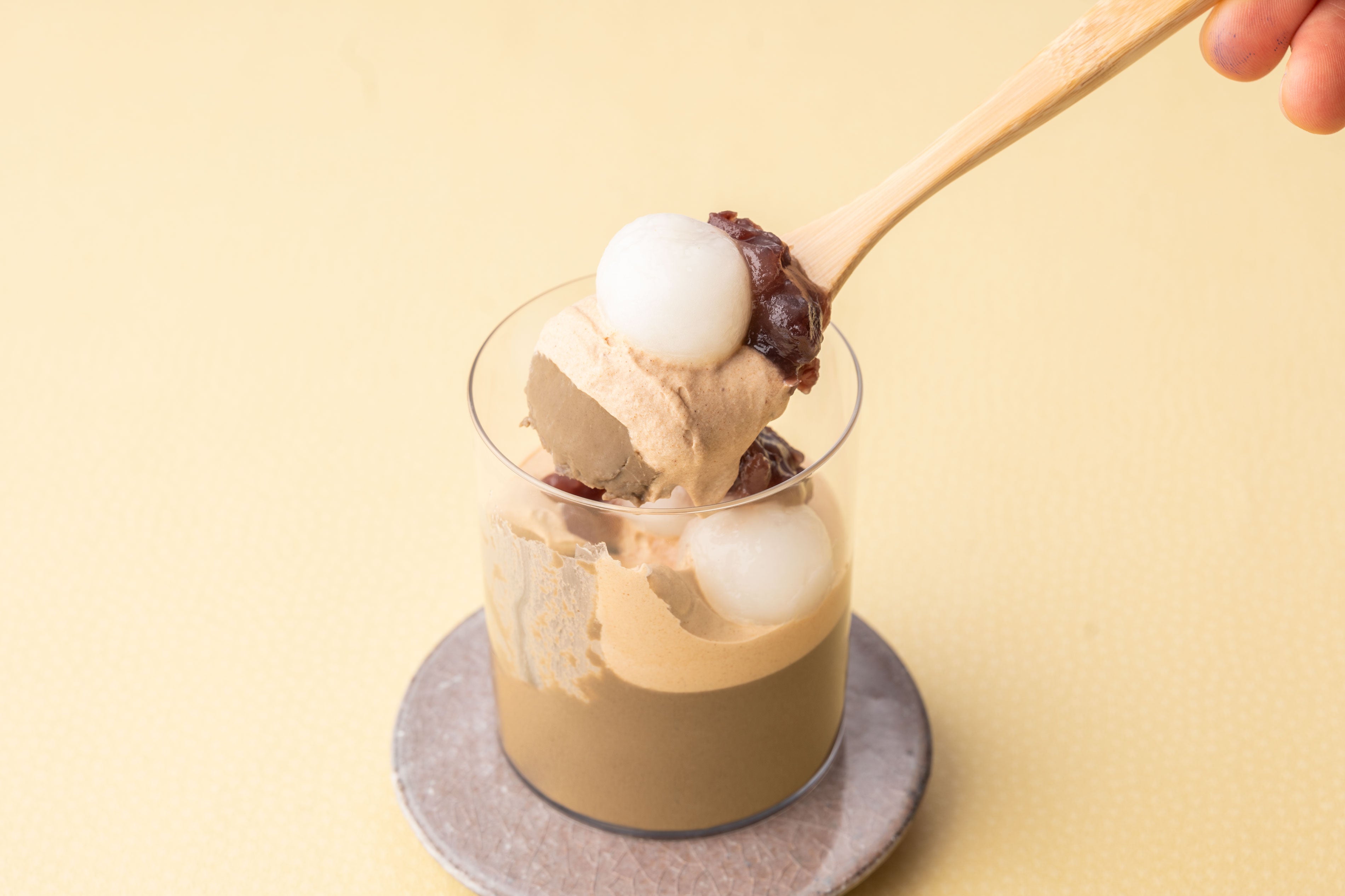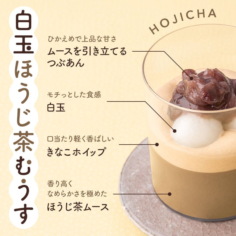 食べた瞬間から、ほうじ茶の芳醇な香りが口いっぱいに広がる「白玉ほうじ茶むうす」は、なめらかさを極めたほうじ茶ムースに軽やかな「きなこホイップ」を合わせることで、まろやかかつすっきりとした味わいに仕上がりました。