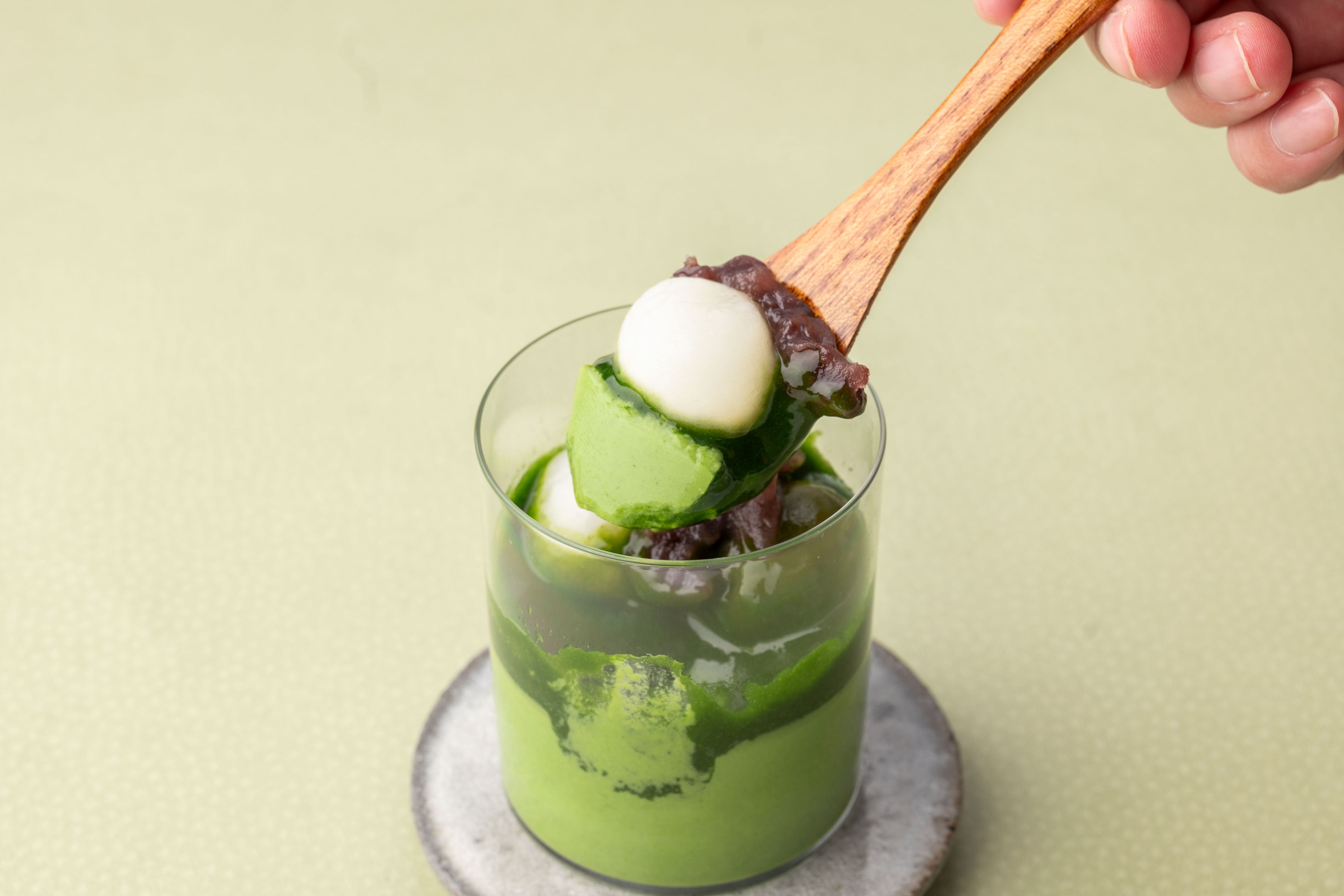 祇園辻利の抹茶を練り込んだ「抹茶白玉」、むうすに合うようにブレンドした、上品な甘さ控えめの「つぶあん」をたっぷり添えているので、最後の一口まで茶寮都路里“定番の味”をお楽しみいただけます。