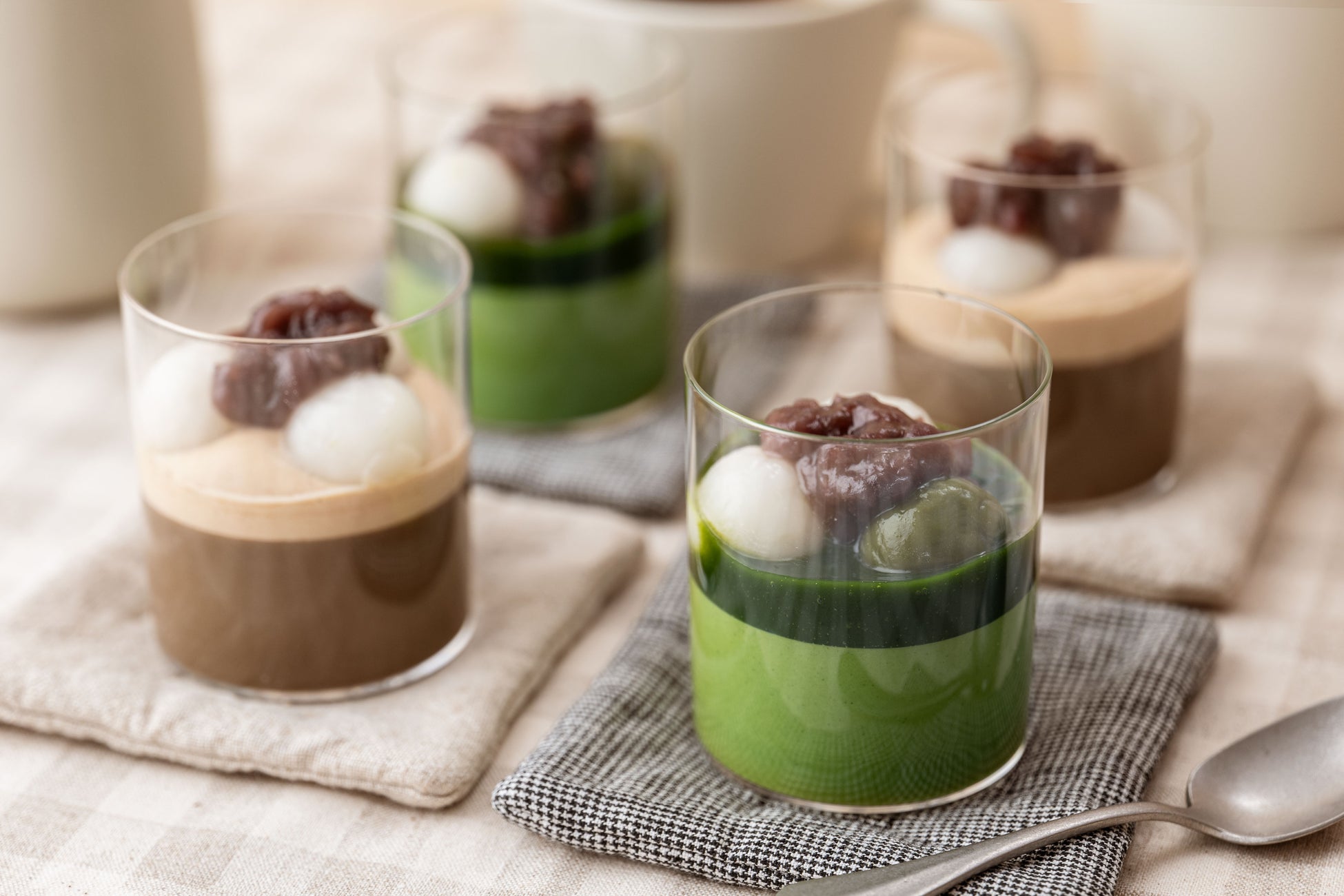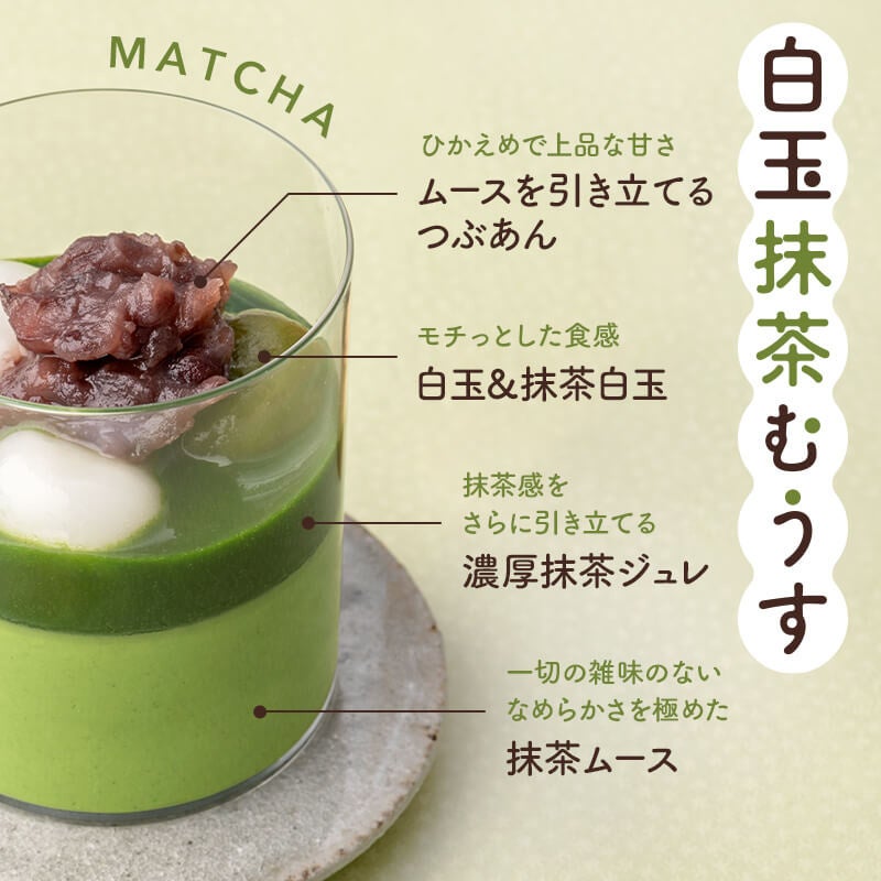 アクセントに、ミルキーでソフトな抹茶の旨味と優しい苦みなめらかなムースを味わえる「白玉抹茶むうす」。トッピングには、もっちり食感の「白玉」と