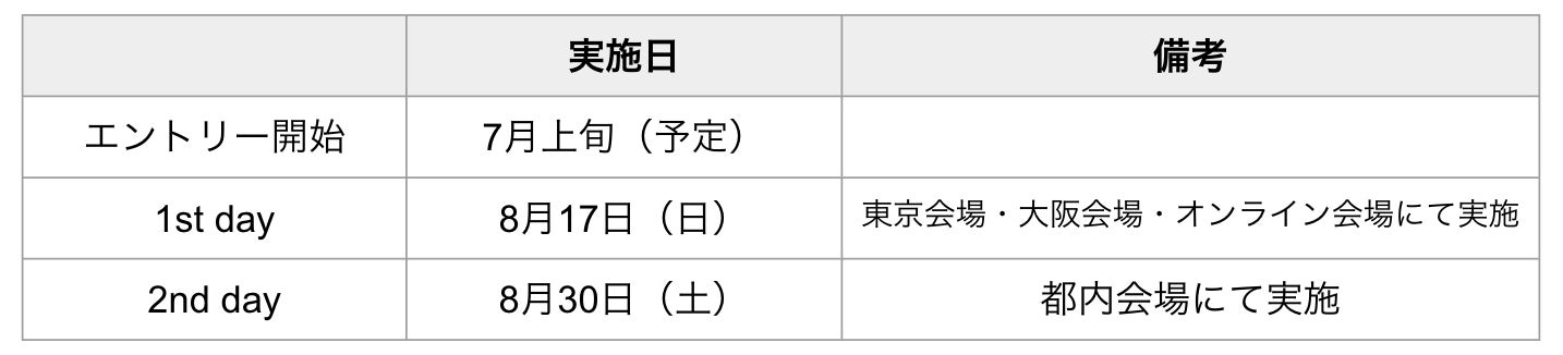 今年も昨年同様、エントリーした全員が参加できる1st dayと、1st dayを勝ち抜いた人のみが参加できる2nd dayの2日間にわたって行われます。1st dayは8月17日(日)、2nd dayは都内会場にて8月30日(土)に開催予定です。