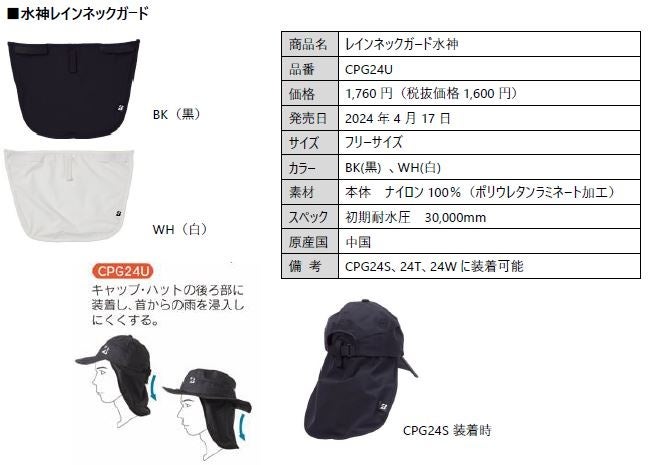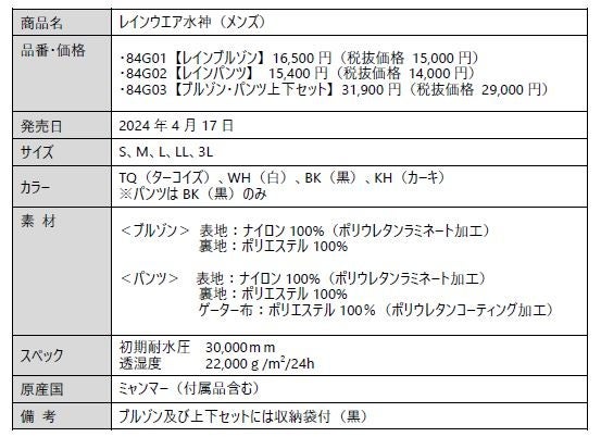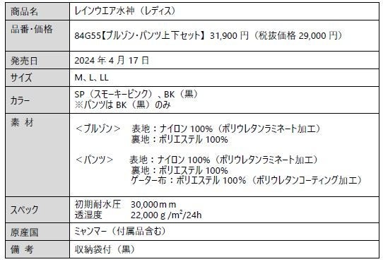 また、今作より新たにレディスモデルもラインアップし、レインウエアとコーディネイトできるレインアクセサリー類も豊富に取り揃えています。