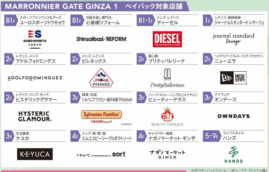 マロニエゲート銀座1 B1F~9F全店舗(3Fスターバックスコーヒー、4Fシープラプレミアム除く)