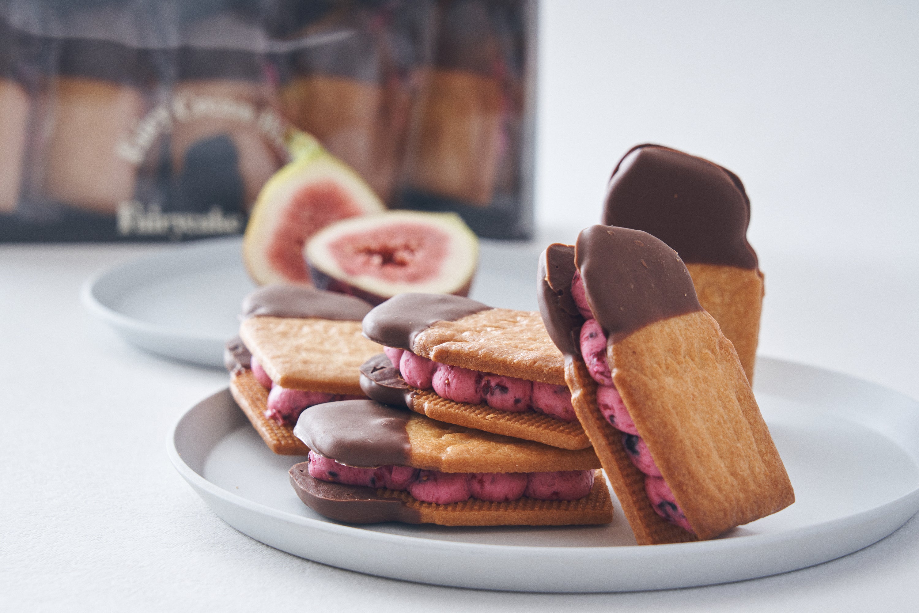 ひんやりと冷たい豊潤ないちじくカシスの“ジャム生バタークリーム”は、ミルクチョコレートでハーフコーティングしたビスケットでひとつひとつサンド。じっくりと丁寧に焼き上げた香ばしいビスケットにクリームがよく馴染み、さっくりとしながらも心地の良い独特なしっとり食感が楽しめます。