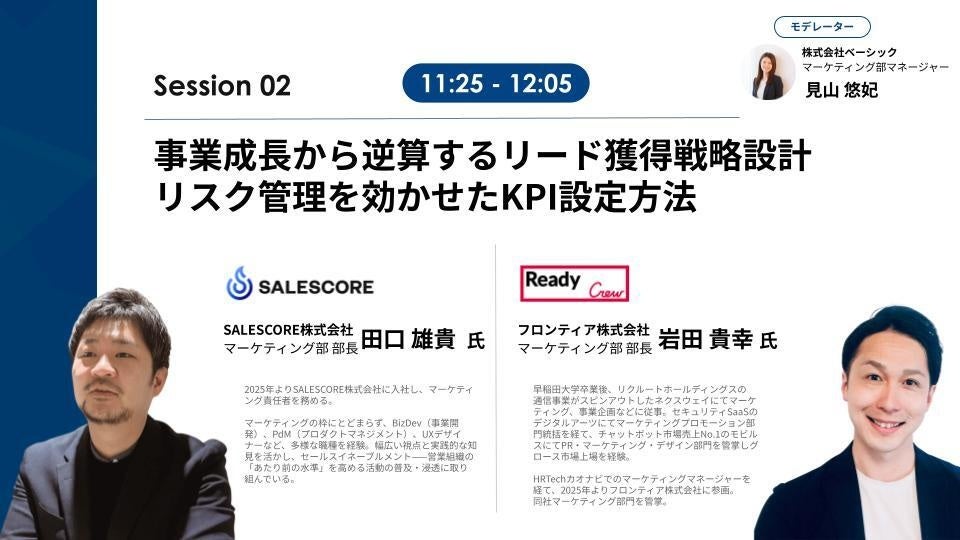 ビジネスマッチングサービス「Ready Crew(レディクル)」を運営する、フロンティア株式会社(本社:東京都渋谷区、代表取締役社長:高橋 政裕、以下 当社)は、株式会社ベーシック(本社:東京都千代田区、代表取締役:秋山勝)が主催する「BtoB Marketing Academy Conference リード獲得の”選択と集中”」にて、「事業成長から逆算するリード獲得戦略設計 ~リスク管理を効かせたKPI設定方法~」と題したセッションに登壇いたします。