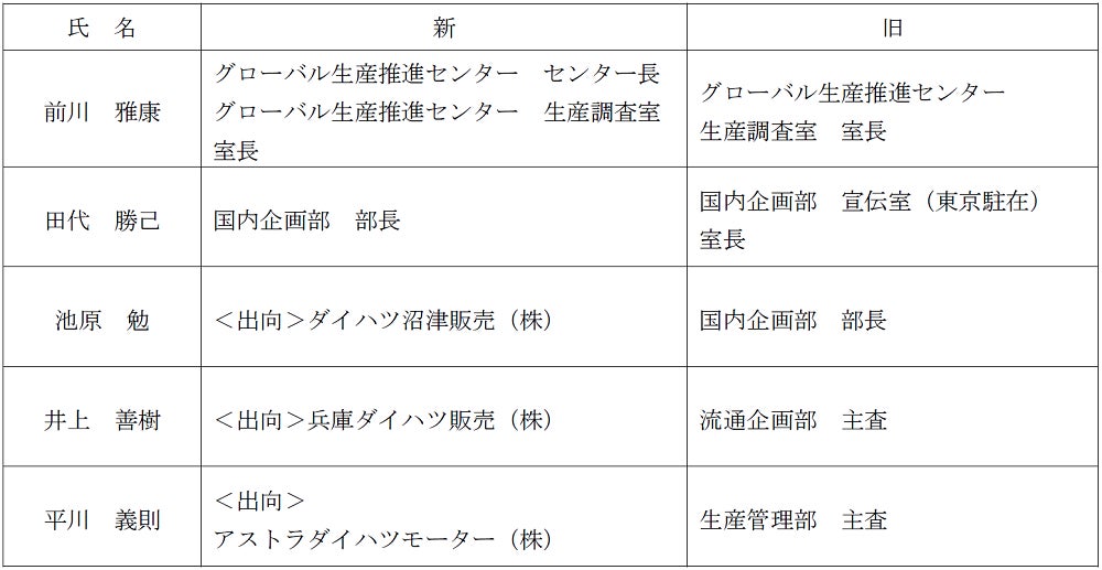 ダイハツ工業株式会社は、2022年6月1日付で下記の通り、役員、幹部職の人事異動を行います。
