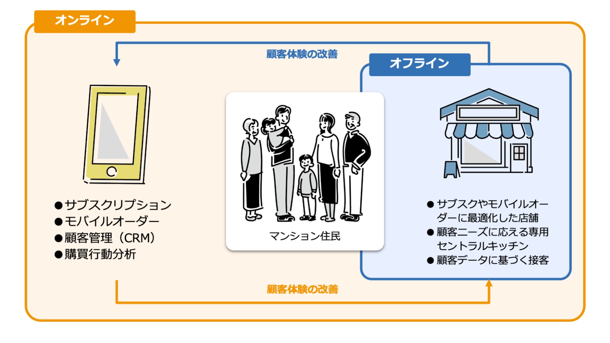 サブスクやモバイルオーダーで顧客ごとのデータを管理、顧客の利用頻度や嗜好を分析(オンライン側)し、店舗スタッフが店舗でいつでもその情報を見られる状態にすること(オフライン側)で、相互に改善を繰り返し、最適な接客を店舗で毎日提供することができます。マンション居住者の体験の向上を目指していきます。