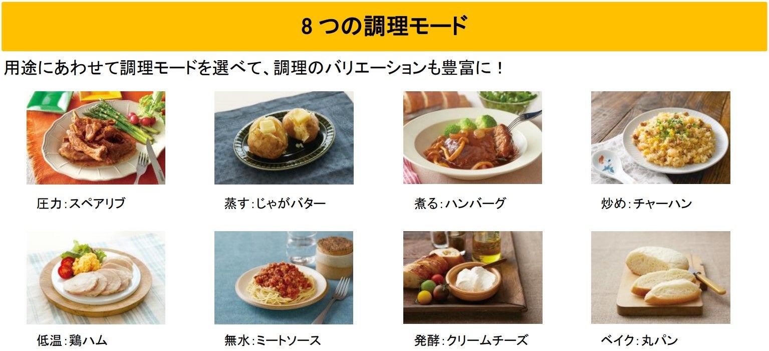 「ラクラ・クッカー プラス コンパクト電気圧力鍋」には、8つの調理モード(「圧力」「蒸す」「煮る」「炒め」「低温」「無水」「発酵」「ベイク」)と4つのレシピモード(カレー、角煮、豆類、なべ)、4つの炊飯モード(白米、玄米、餅米、お粥)があり、時短料理から本格料理まで幅広い料理をおいしく作ることができる電気圧力鍋です。料理研究家監修の105レシピが入ったレシピブック付き。発酵モードでパンの生地を発酵させてそのままベイクモードでパンを焼くこともできるので、毎日のおかずはもちろん、デザートからパン作りまでレパートリーが広がります。