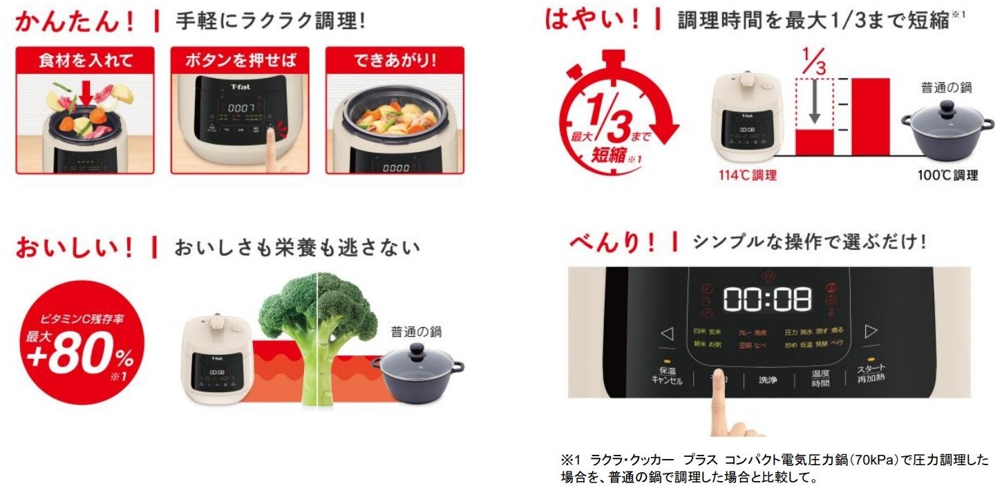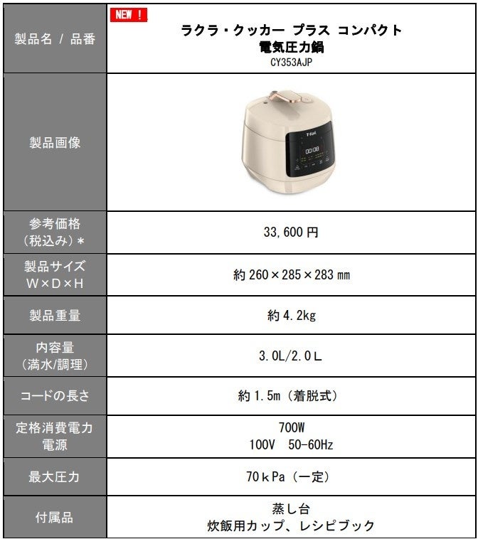 株式会社グループセブ ジャパン(本社:東京都港区/代表取締役社長:アンドリュー・ブバラ)は、2022年9月、ティファールから電気圧力鍋「ラクラ・クッカー プラス コンパクト電気圧力鍋」をリニューアル発売いたします。