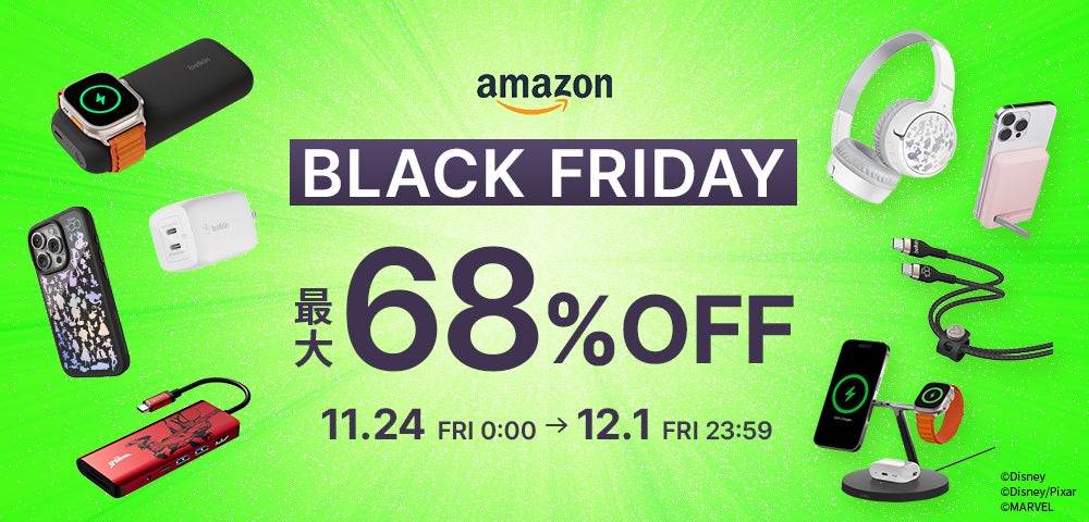 米カリフォルニア発、洗練されたデザインと快適なライフスタイル体験を提案し、グローバルで絶大な人気と市場シェアを誇るスマートフォン・PC関連製品ブランド「Belkin」の日本法人、ベルキン株式会社(以下Belkin、所在地:東京都中央区京橋)は、Amazon.co.jpで11月24日~12月1日に開催されるAmazon ブラックフライデーにて172製品を最大68%オフで販売いたします。また、11月22日から開催される先行セールでも一部製品をセール価格にて販売いたします。