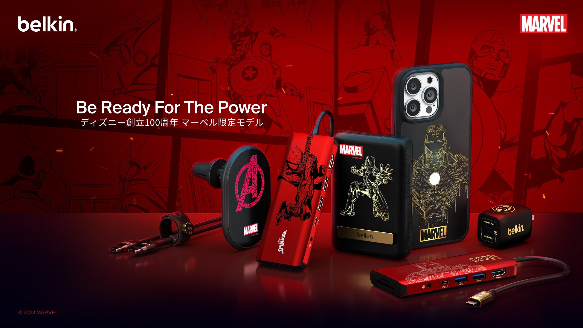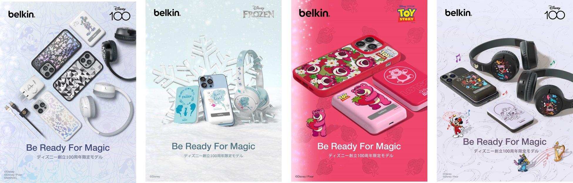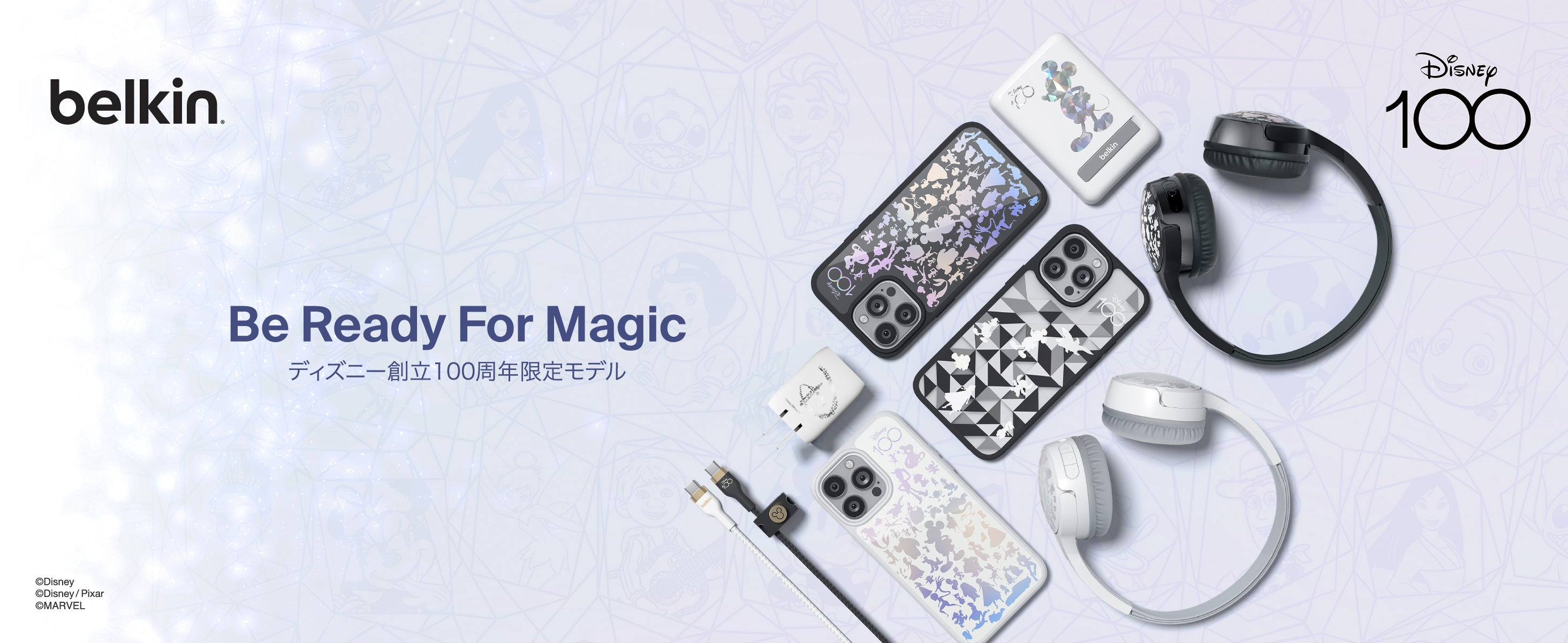 Belkinの創業40周年を記念し、2023年に創立100周年を迎えたディズニーをテーマにした初のコラボレーション製品です。Disney100、MARVEL、PIXARを含む5つのテーマの全31種類のラインアップで、iPhone 15 Pro, Pro Max用MagSafe対応iPhoneケース、スタンド付きMagSafe対応マグネットバッテリー、USB-Cハブなどをそろえています。