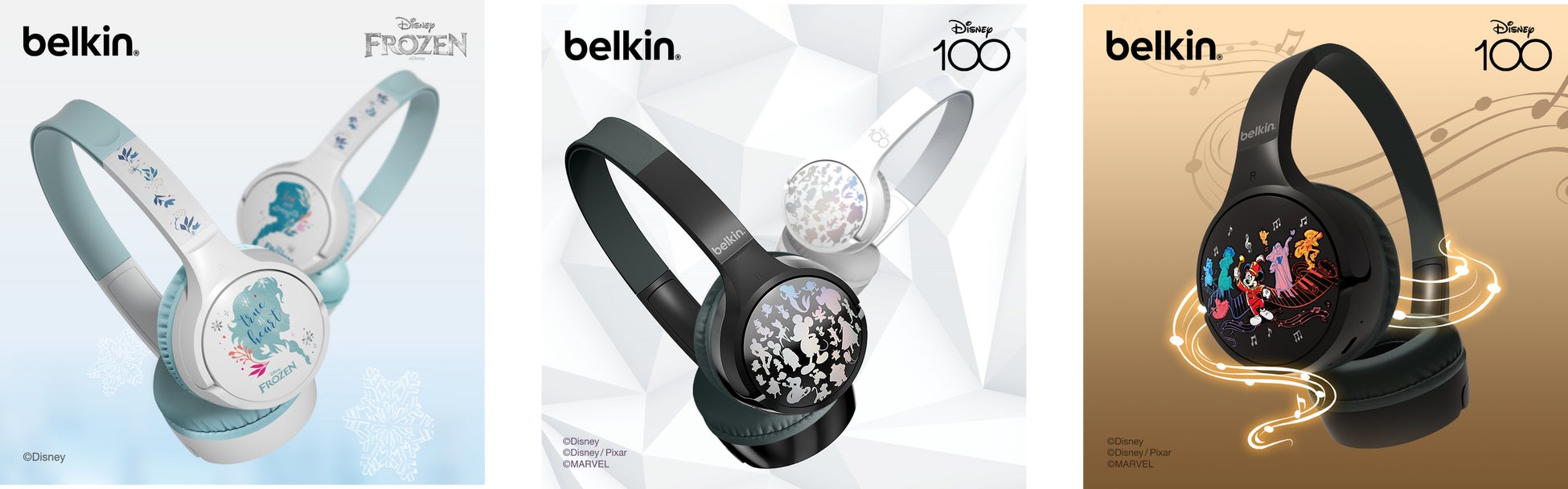 ・「アナと雪の女王」、ミッキーマウスのシルエット、Disney 100 MUSICAL WONDERがデザインされた子供用ヘッドフォン。本製品はAmazon Black Friday特選セールにも選ばれております。