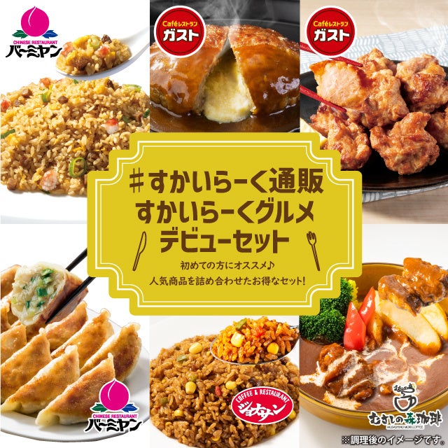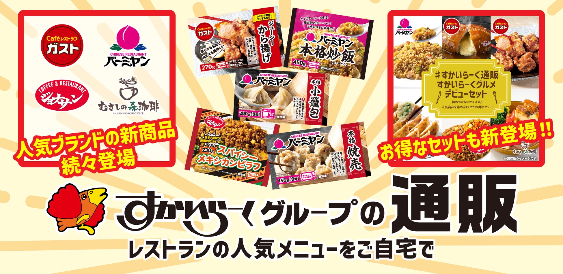 | 【すかいらーく通販サイト取扱商品 おすすめポイント】 ① 通販取り扱い新商品が12品登場!人気商品をネットで楽々購入 お客さまの中食需要の高まりを受け、ガストなどで提供している人気メニューが新たに加わり、通販サイト取扱商品を10品以上拡大。通販商品をご自宅でいつでも気軽にご購入いただけます。 ② 加熱するだけの簡単調理で、いつでも自宅で人気メニューの味わいを! ガスト「ジューシーから揚げ」やバーミヤン「本格炒飯」など、お食事の一品やお弁当のおかずに活用できる商品をラインナップ。冷凍での販売のため、使いたい時に必要な分だけお召し上がりいただけます。 ③ 便利な機能が満載!3月中にすかいらーくアプリからも注文可能に! お得な「クーポン」や、事前決済可能なテイクアウト・宅配の「ネット注文」など便利な機能が多数搭載のすかいらーくアプリに、3月中に「通販商品注文」機能を搭載予定。 |