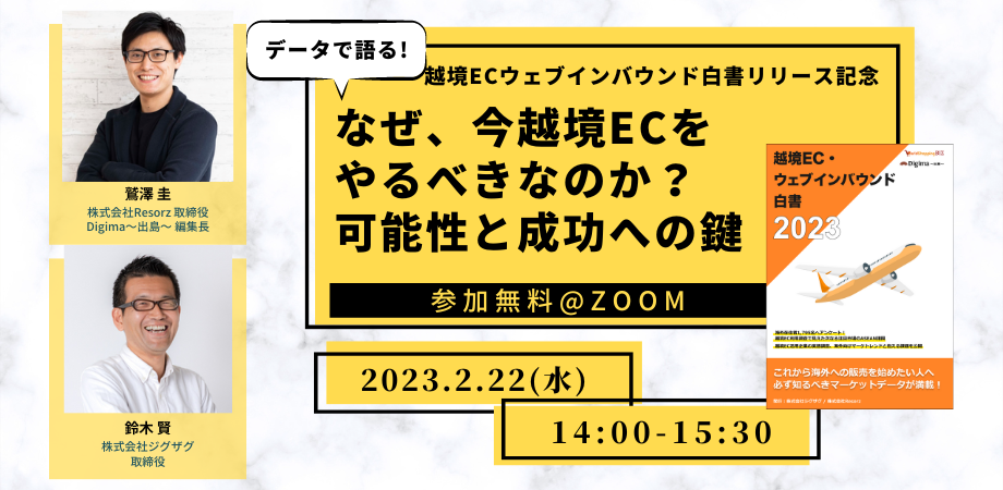 WorldShopping BIZを提供する株式会社ジグザグ(本社:東京都渋谷区、代表取締役:仲里一義)は、海外ビジネス支援プラットフォーム「Digima~出島~」等を運営する株式会社Resorz(本社:東京都新宿区、代表取締役 兒嶋裕貴)と、「越境EC・ウェブインバウンド®白書2023」のリリース(2023年2月20日リリース予定)を記念したウェビナー「なぜ、今越境ECをやるべきなのか?可能性と成功への鍵」を開催いたします。
