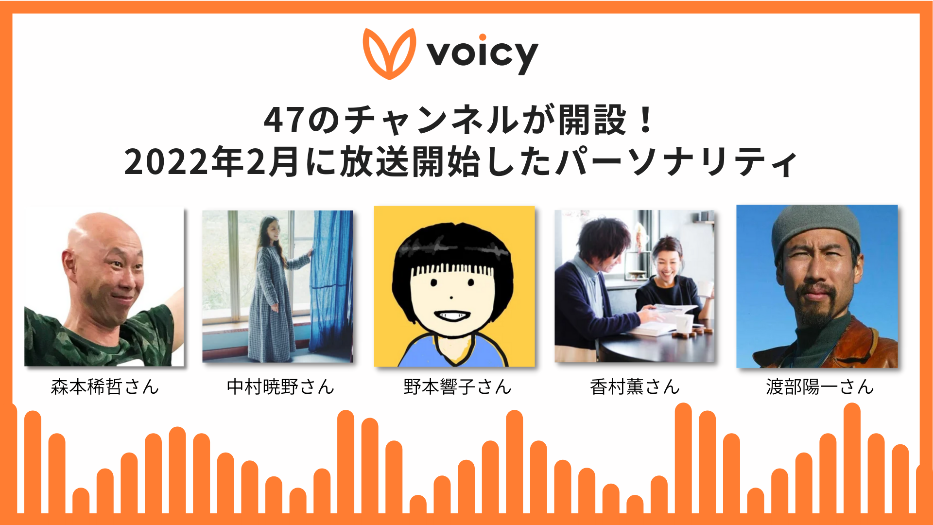 株式会社Voicyが運営する年間利用者数1,300万人の音声プラットフォームVoicyで、2022年2月に新たに47のチャンネルが放送を開始しました。多方面で活躍するパーソナリティがVoicyに仲間入り。今後も魅力あるパーソナリティの放送で、生活に彩りを添えるプラットフォームを目指していきます。