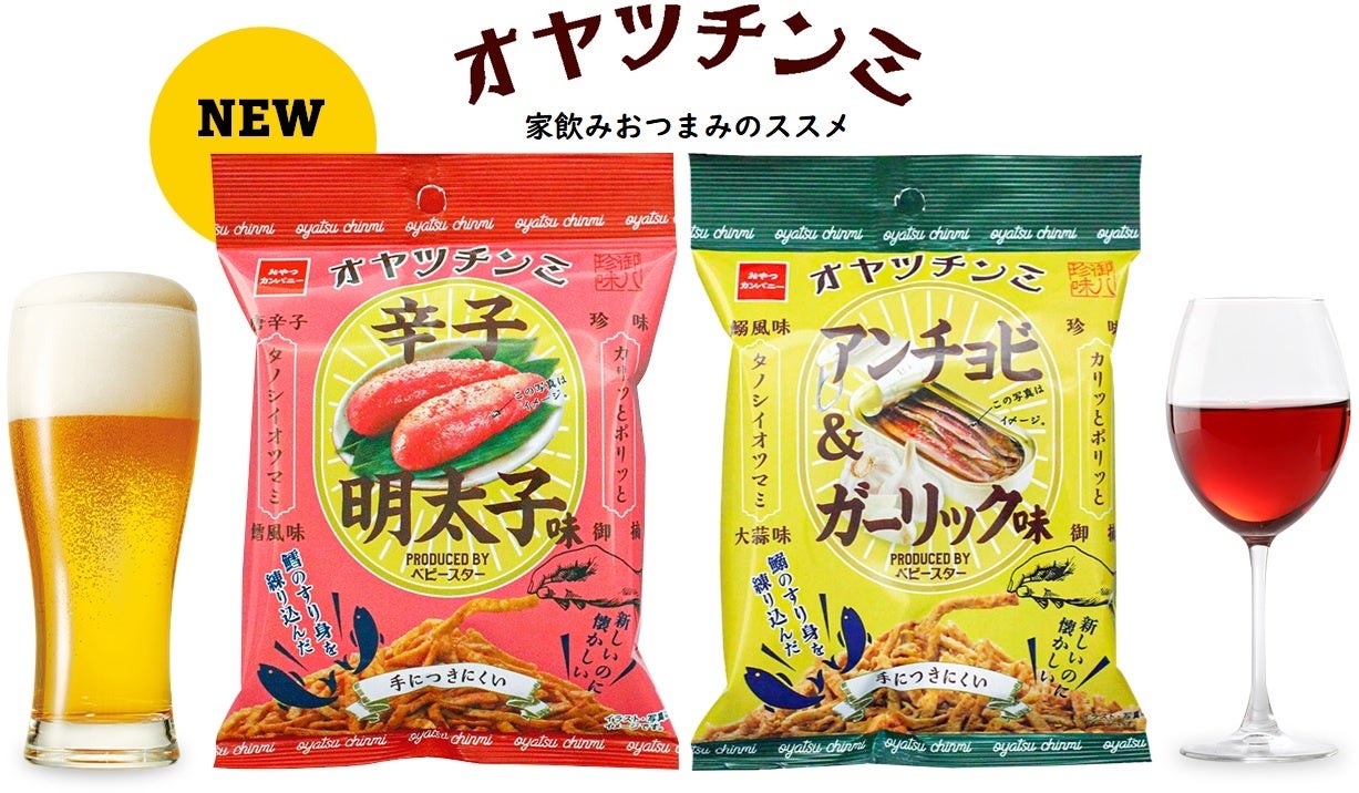 製麺技術から生まれた「ベビースターラーメン」は、麺の生地に様々な素材を練りこんで味付けをすることで、油で揚げても、粉や油が“手につきにくい”スナック菓子です。「オヤツチンミ」はこのベビースター製法を応用し、衣をつけずにフライすることで、粉や油が“手につきにくい”のに揚げ物おつまみらしいカリッポリッとした食感を実現。魚介のすり身を生地にたっぷりと練りこむことで、珍味らしい味わい深い魚介の風味が楽しめる“家飲み”に最適な新感覚おつまみです。
