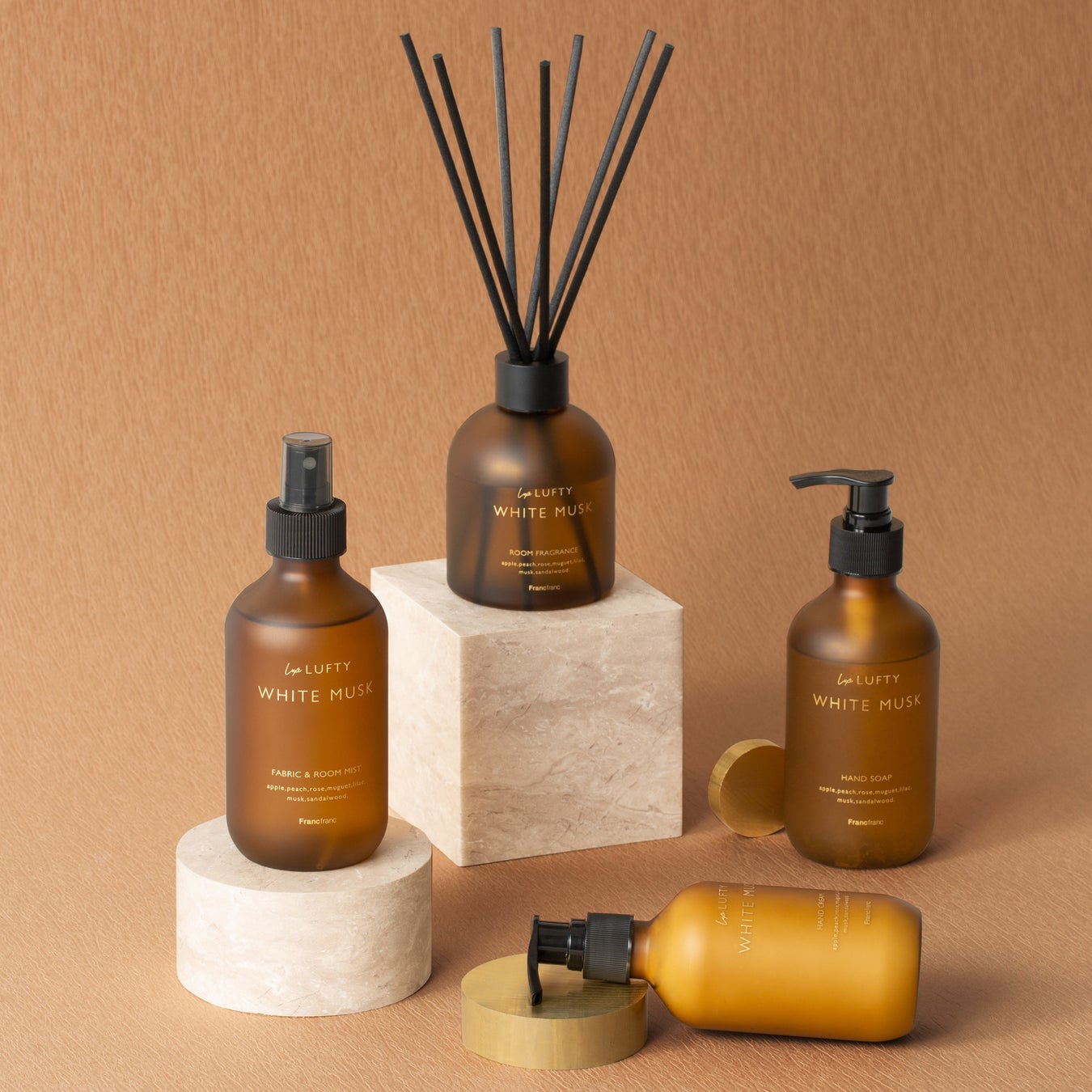 人気のルフティーシリーズにフランス語で「贅沢な」「高級な」を意味する「リュクス」の名の通り高級感ある新作が登場しました。フロスト加工にゴールドの印字がアクセントになったインテリアとしても素敵なフレグランスです。ルームフレグランスは消臭機能はそのままに賦香率をUP、ファブリックミストはウィルス抑制・除菌・抗菌機能はそのままに消臭成分を3倍配合しました。ハンドソープとハンドクリームは保湿力UP、賦香率UPで香りがより長持ちに。ハンドソープはスクラブ入りで手のキメを整えます。