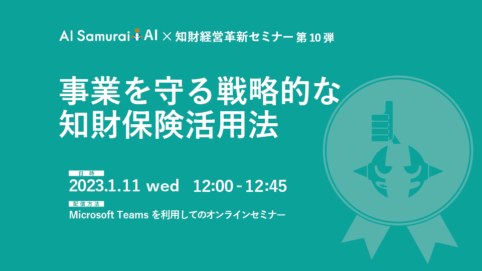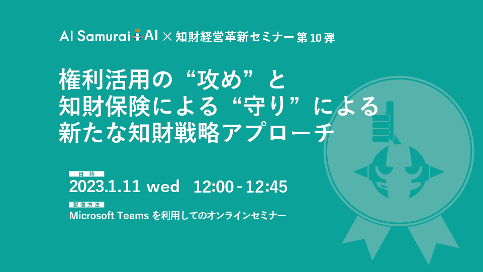 株式会社AI Samuraiは、「権利活用の“攻め”と知財保険による“守り”による新たな知財戦略アプローチ」セミナーを2023年1月11日(水)午前12:00から開催します。