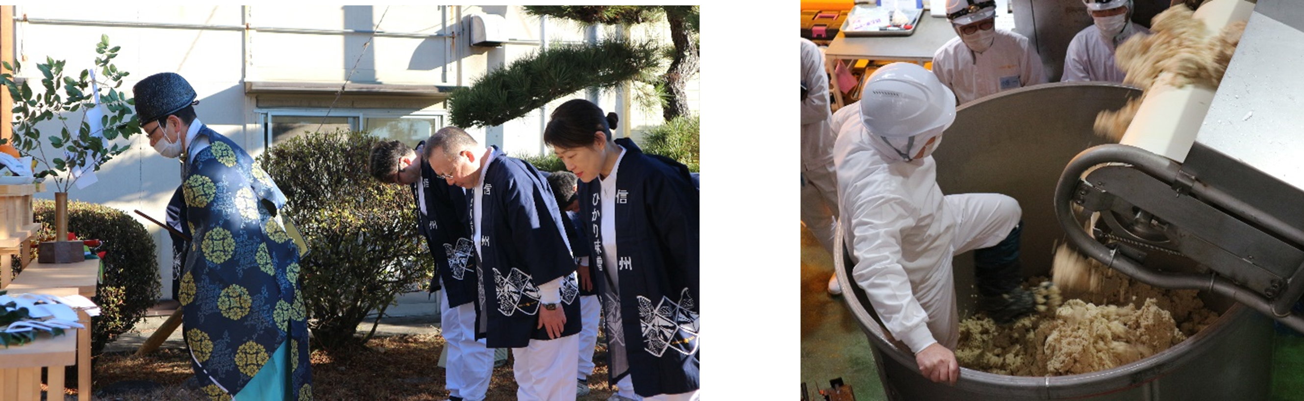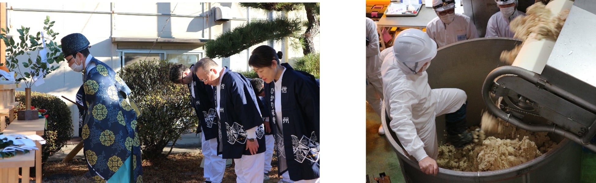 ひかり味噌󠄀の「大寒仕込み」は、飯島グリーン工場内の醸造の神を祀る京都の松尾大社に由来する祠で、一年間の味噌󠄀づくりの豊穣と息災、おいしい味噌󠄀の仕上がりを祈願することから始まります。その後、蒸煮した大豆に、前もって準備したみそ玉を砕いて加え、米麹、塩と混合して2トンタンクに流し込みます。その際、タンクの中で、味噌󠄀を足で踏みならして空気を抜くことで、均一に発酵・熟成が進むようになります。また、蒸煮した国産大豆をつぶして、温かいうちに高さ20cm程の円柱形に手で丸めて作ったみそ玉は、ゆっくりと乳酸発酵が進み、「大寒仕込み」の味噌󠄀に加えることで、より深い味わいに仕上がります。