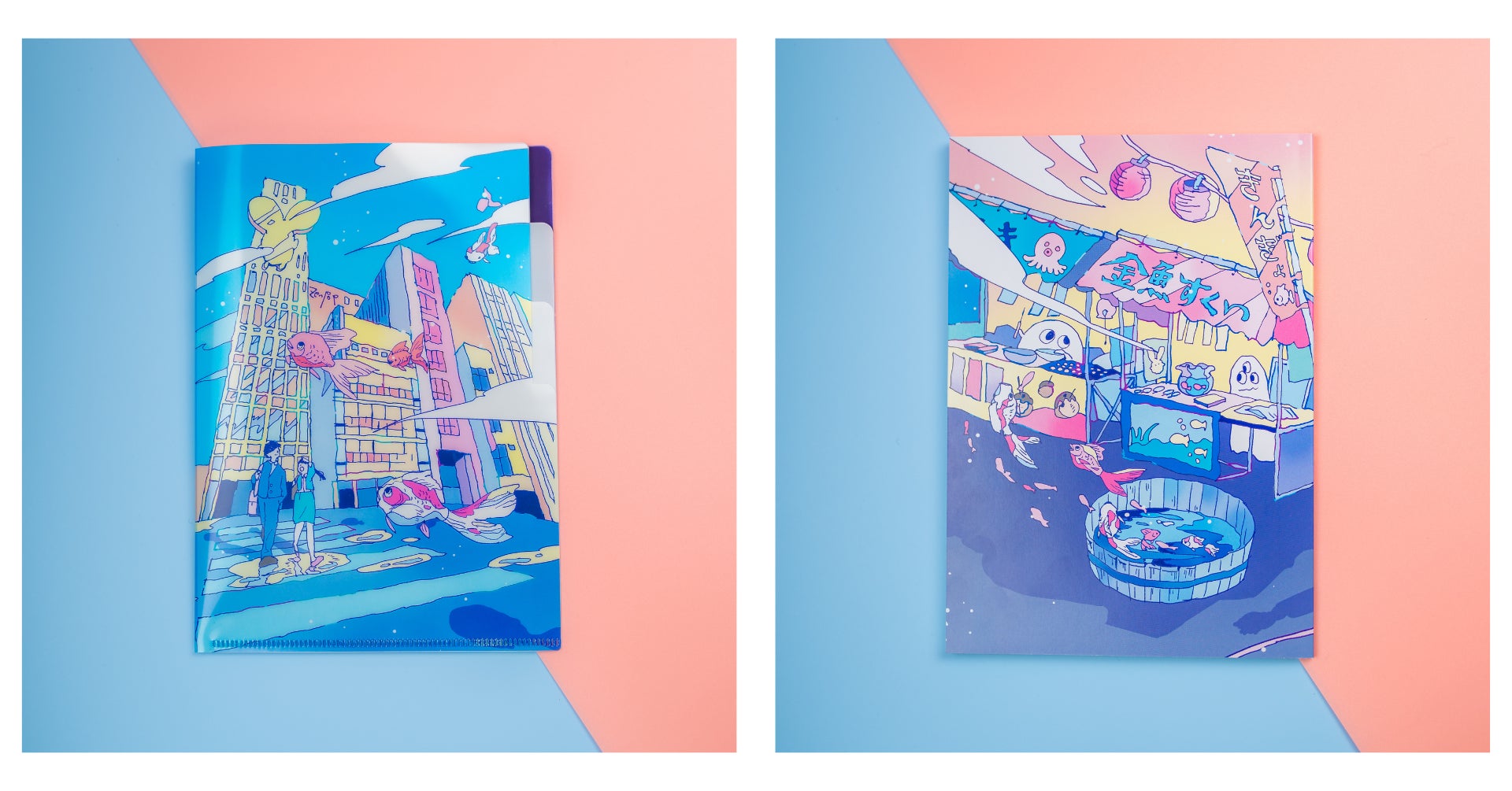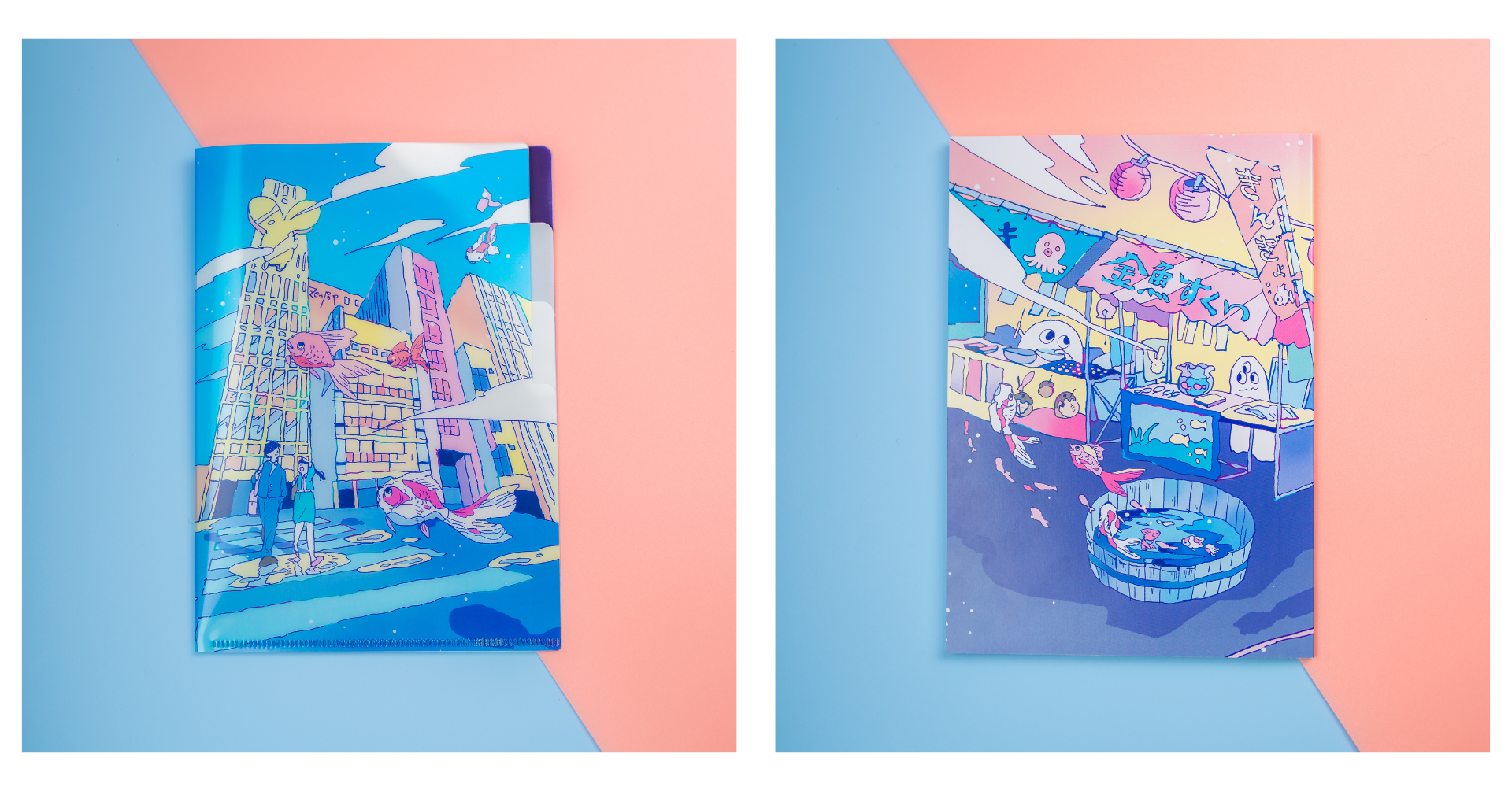 日本における祭の屋台をイメージしたSaigetsuさんによるイラストが施された「A5ノート」をはじめ、ZenGroupにゆかりのある風景、また梅雨をデザインしたイラストで、鞄にも入れやすいコンパクトな「A5サイズクリアファイル」を今回のサブスクリプションボックスのために制作しました。ノートは表紙のイラストが表紙と背表紙、裏表紙まで繋がっており、一枚の絵で日本のお祭りが表現されています。
