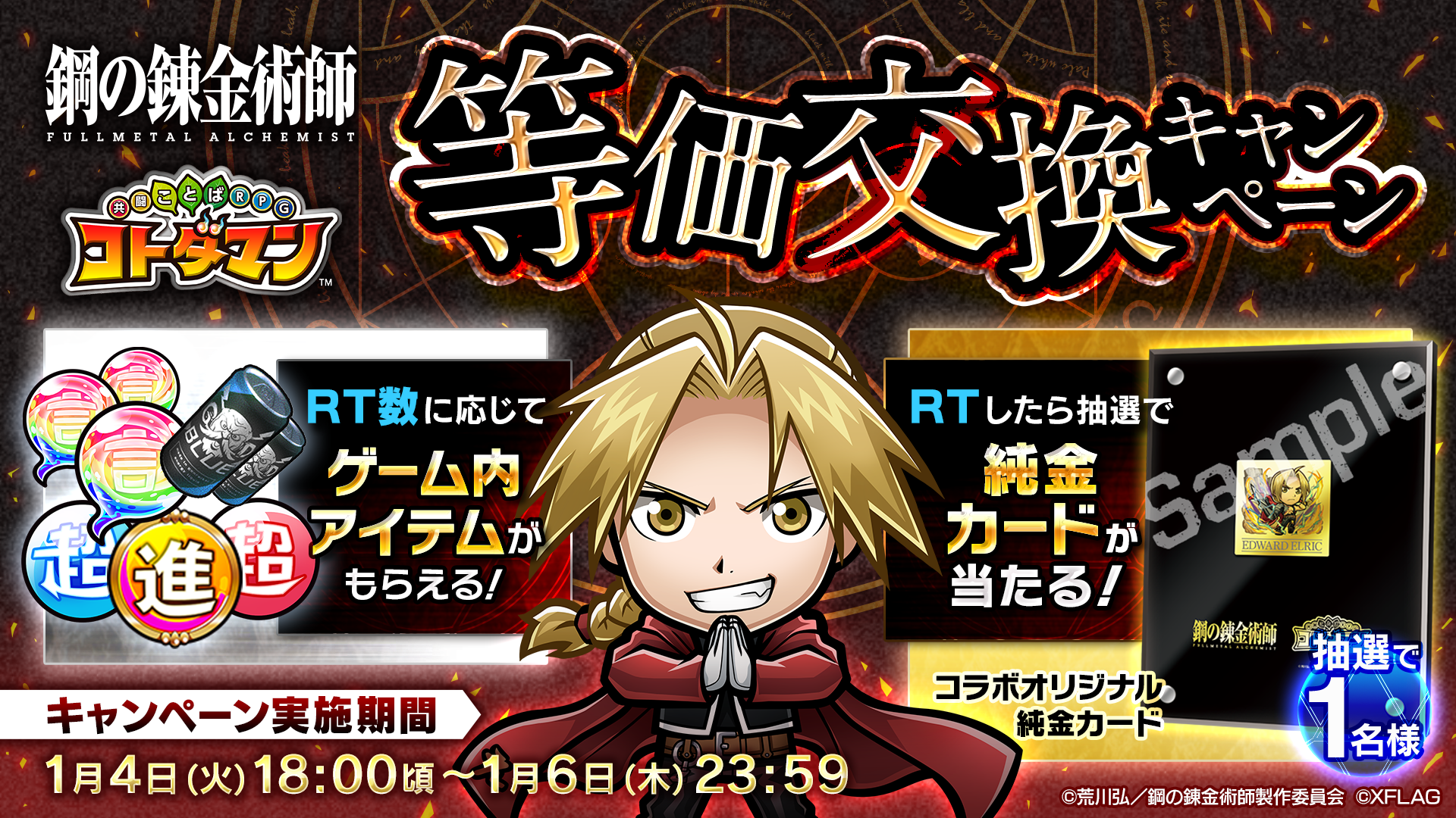 株式会社ミクシィ(東京都渋谷区、代表取締役社長:木村 弘毅)が展開するエンターテインメント事業ブランド「XFLAG (エックスフラッグ)」は、スマホアプリの「ことば」で闘う新感覚RPG「共闘ことばRPG コトダマン」(以下、コトダマン)において、「鋼の錬金術師 FULLMETAL ALCHEMIST」(以下、鋼の錬金術師FA)との初コラボを1月6日(木)より開催します。