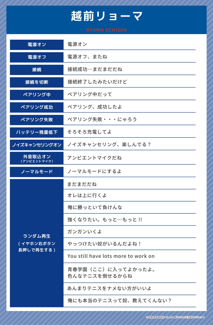 イヤホンの起動/終了や端末との接続状況を告知する「ボイスガイダンス」に加え、作中の印象的なセリフが聴ける「ランダムボイス」も搭載。各選手はアプリで切り替え可能で、2モデル合計17モード350種類以上収録された特別仕様となっています。