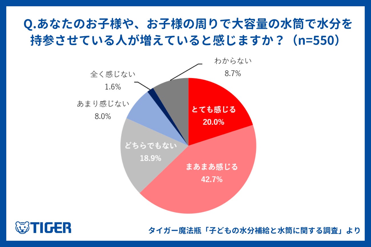 また、「大容量の水筒で水分を持参させている人が増えていると感じるか」という質問においては、「とても感じる」「まあまあ感じる」と回答した人が62.7%で、多くが大容量の水筒を持参している人が増えたことを実感していました。特に夏場は、前述した通り熱中症や水分不足への不安を持つ保護者が多いことから、その対策としてマイボトルを大容量にして持参させる人が多いことが示唆されます。