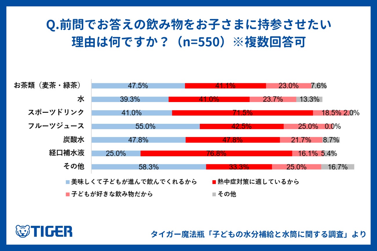 前項の回答の理由として、「お茶類(麦茶・緑茶)」は「美味しく子どもが進んで飲んでくれるから」と、子どもの水分補給の実践しやすさを重視した回答が多く、「スポーツドリンク」や「経口補水液」は「熱中症対策に適しているから」と、水分・塩分ともに補給し熱中症対策に役立てることを重視している人が70%以上と大多数になりました。
