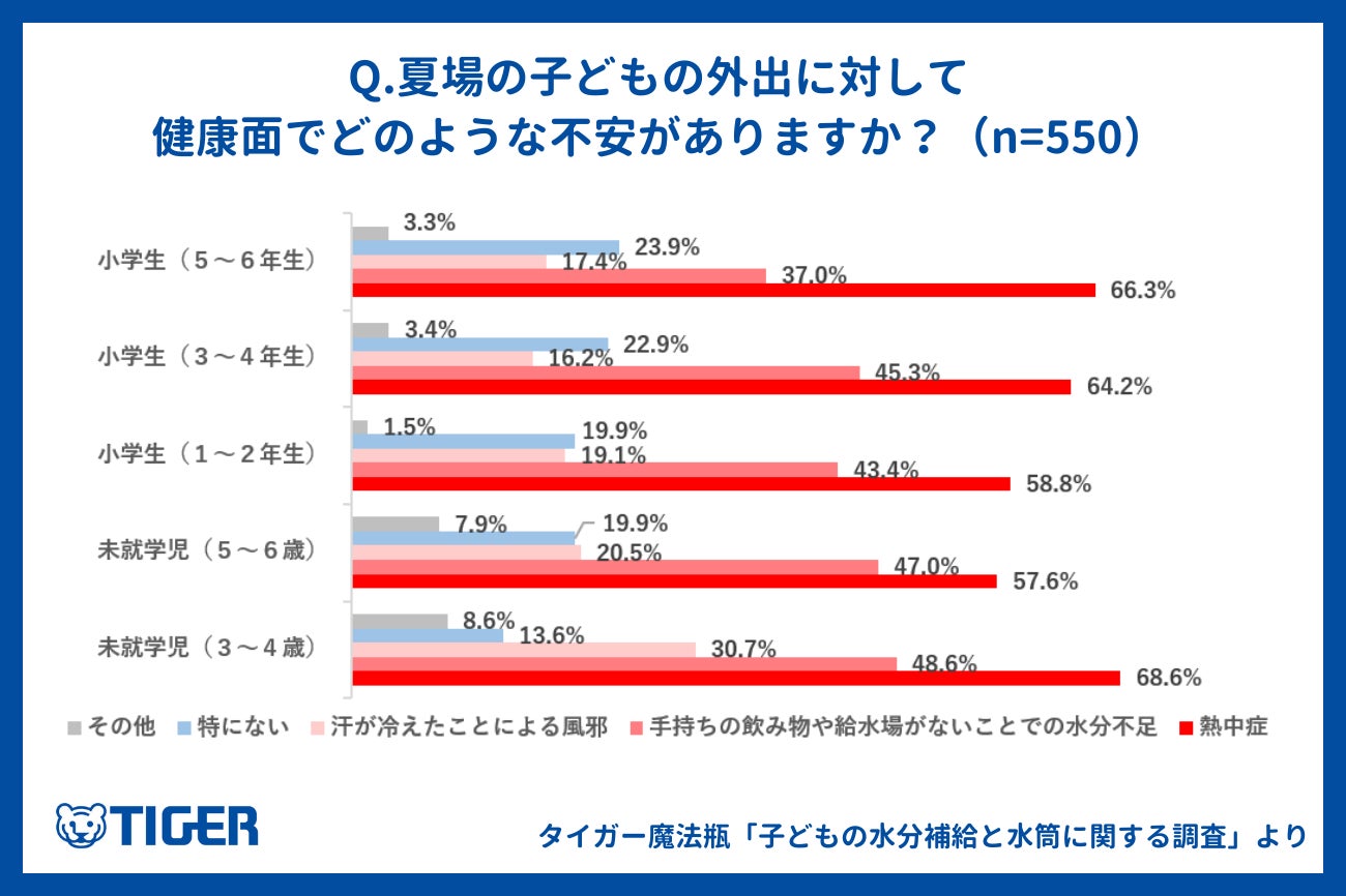 「熱中症特別警戒アラート」が本日から運用開始され、一層熱中症への警戒が高まる今年の夏。実際に、夏場の子どもの外出時、健康面の不安として全年代で過半数が「熱中症」が気になると回答しました。次いで熱中症に関連する「水分不足」と回答する人約半数近くなり、子どもの年齢に関わらず、暑さに対する不安が多いことがわかります。