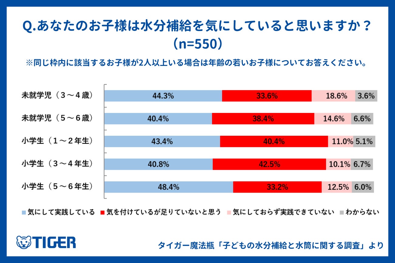 しかし、お子さまが水分補給を気にしているかという調査に対して、「気にして実践できている」のはどの年代も半数以下ということがわかりました。過半数が「気をつけているが足りていないと思う」「気にしておらず実践できていない」と回答しており、保護者の不安と子どもの実態にギャップが生じています。小学3~4年生は、学校生活に慣れておらず親の目の届きやすい1~2年生や自立し始める5~6年生と比較して「気にして実践している」の回答が2.6~7.6ポイント低く、その要因のひとつとして、学校生活には慣れてきたものの、熱中症対策や水分補給まで自分で気にかけられていないことが考えられます。