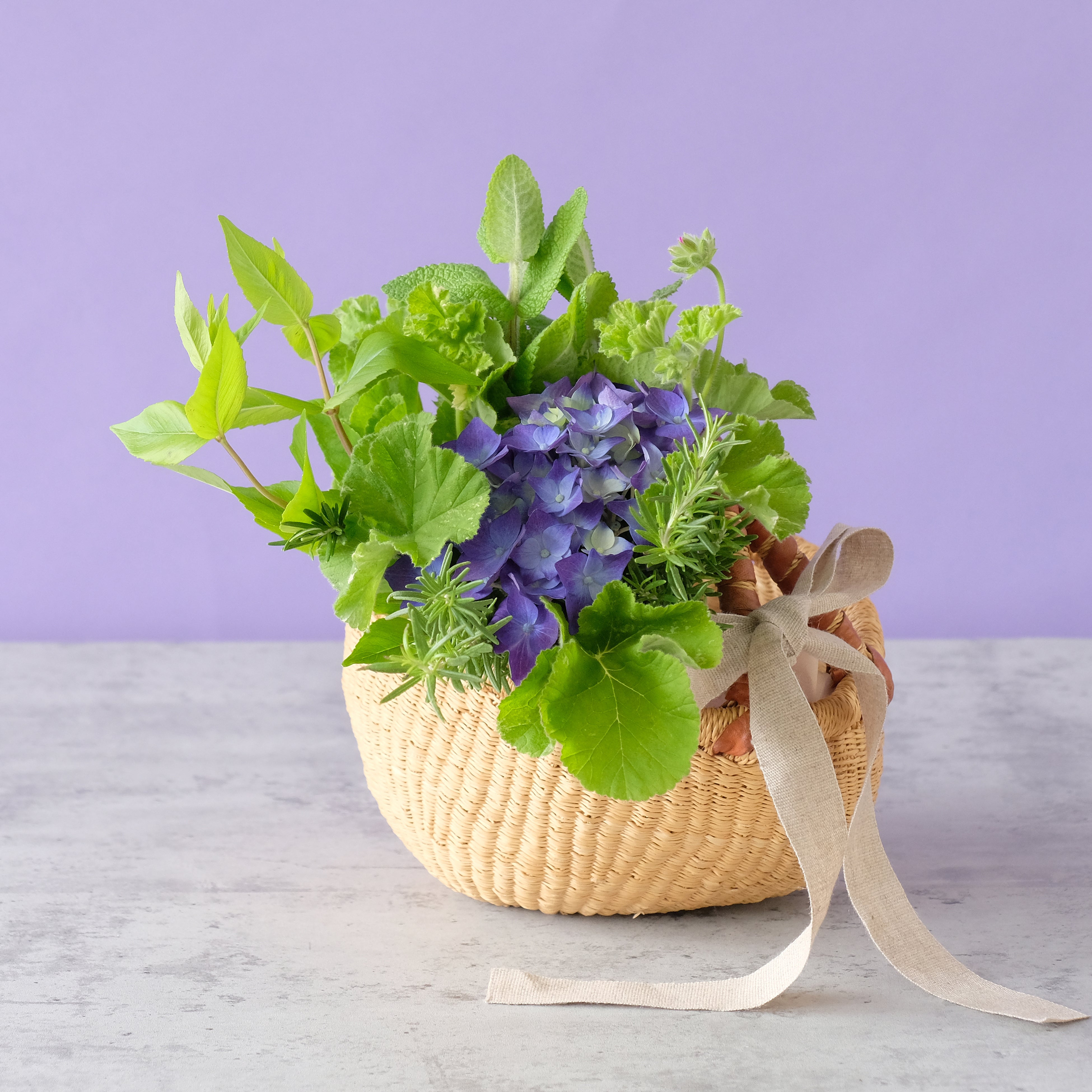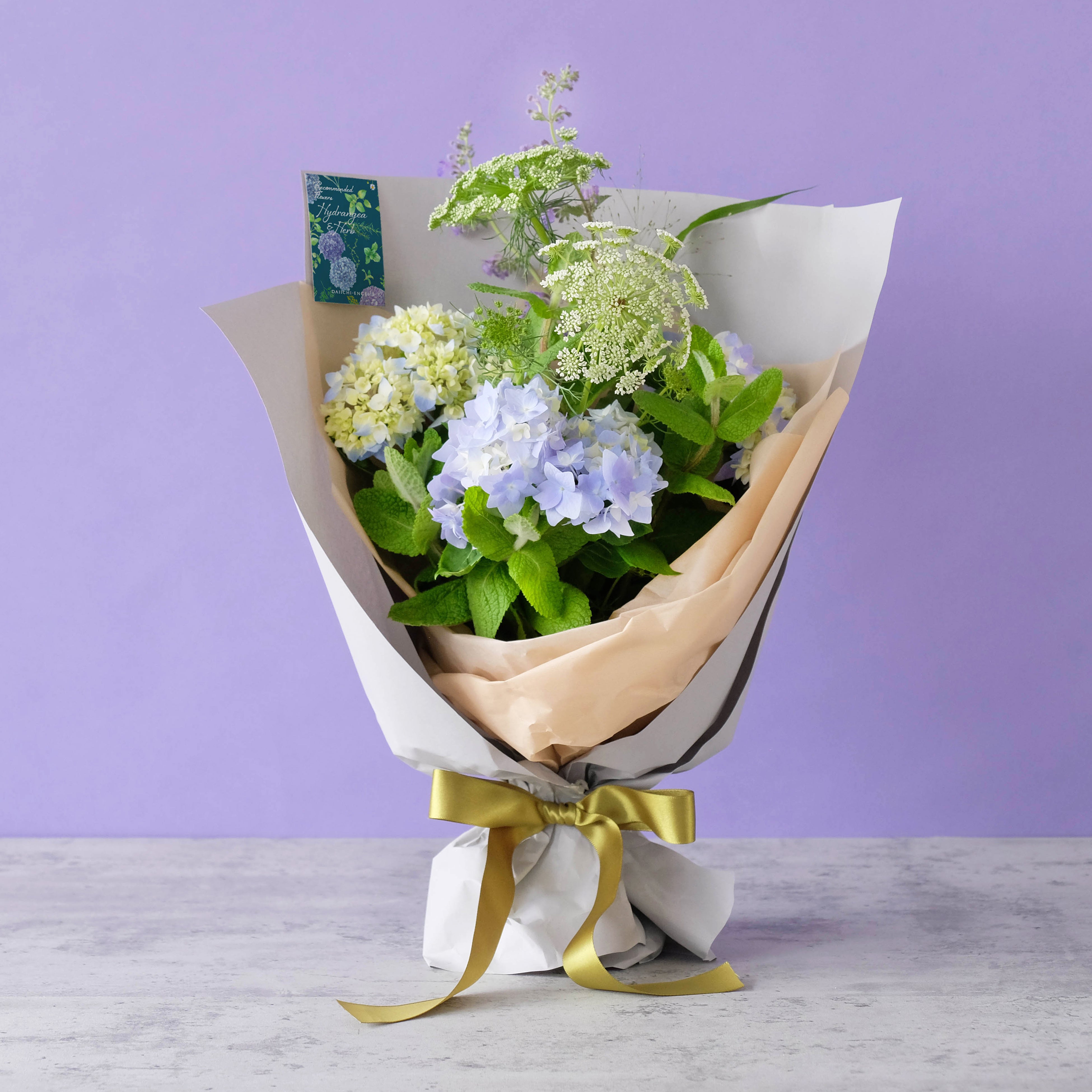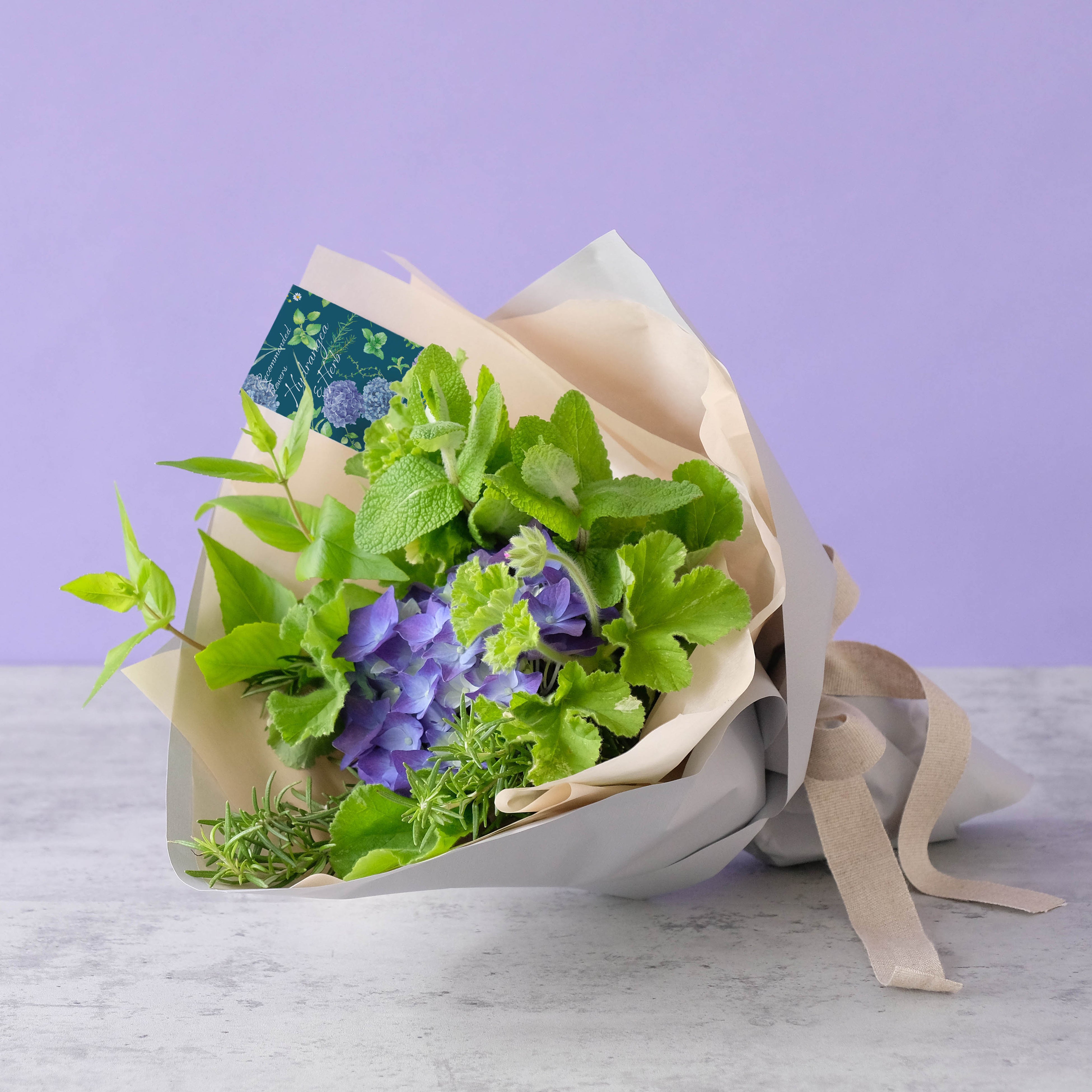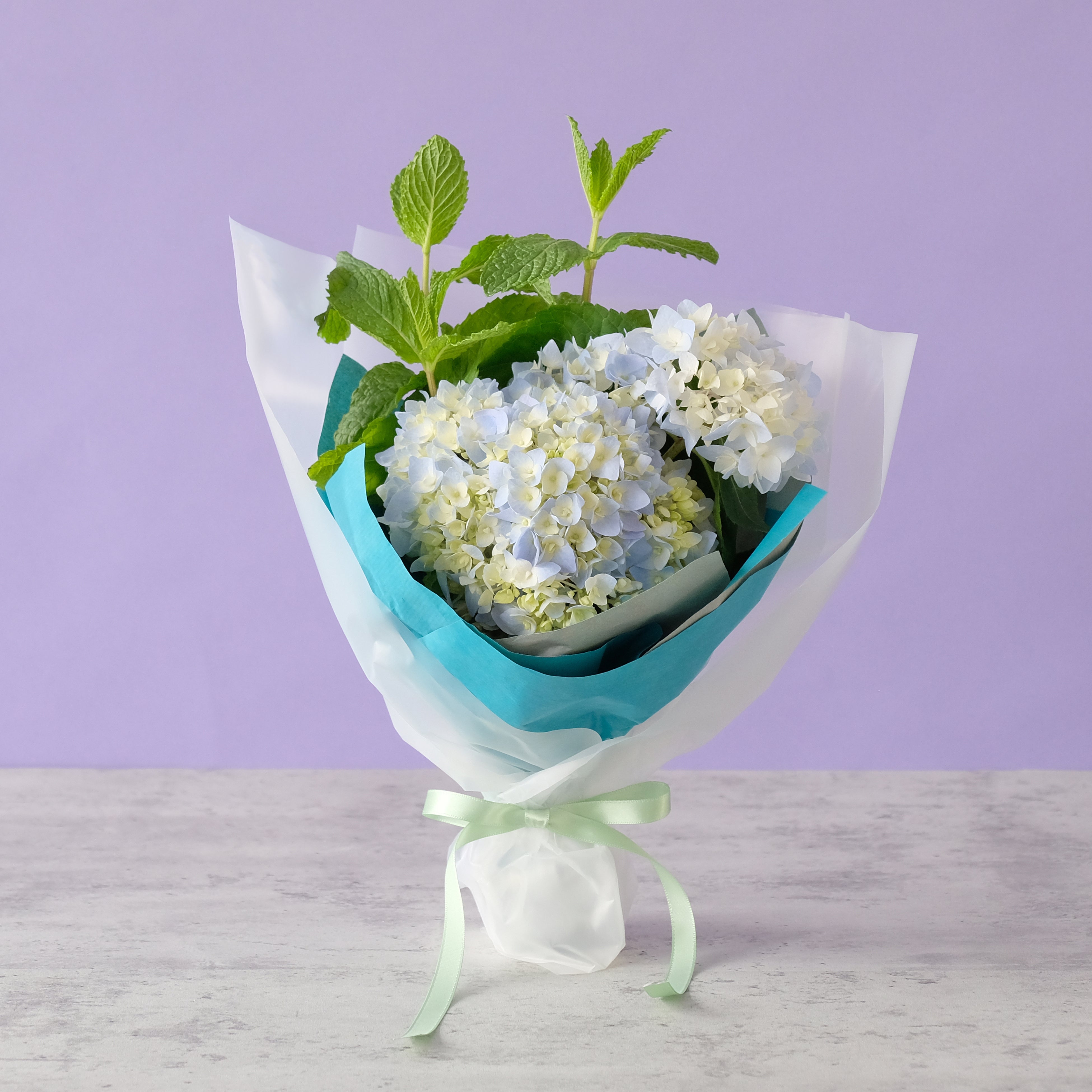 たっぷり入ったハーブのグリーンがアジサイを引き立てる、色と香りを楽しめるブーケです。ちょっとしたお手土産にも、ご自宅のインテリアグリーンにもぴったり!