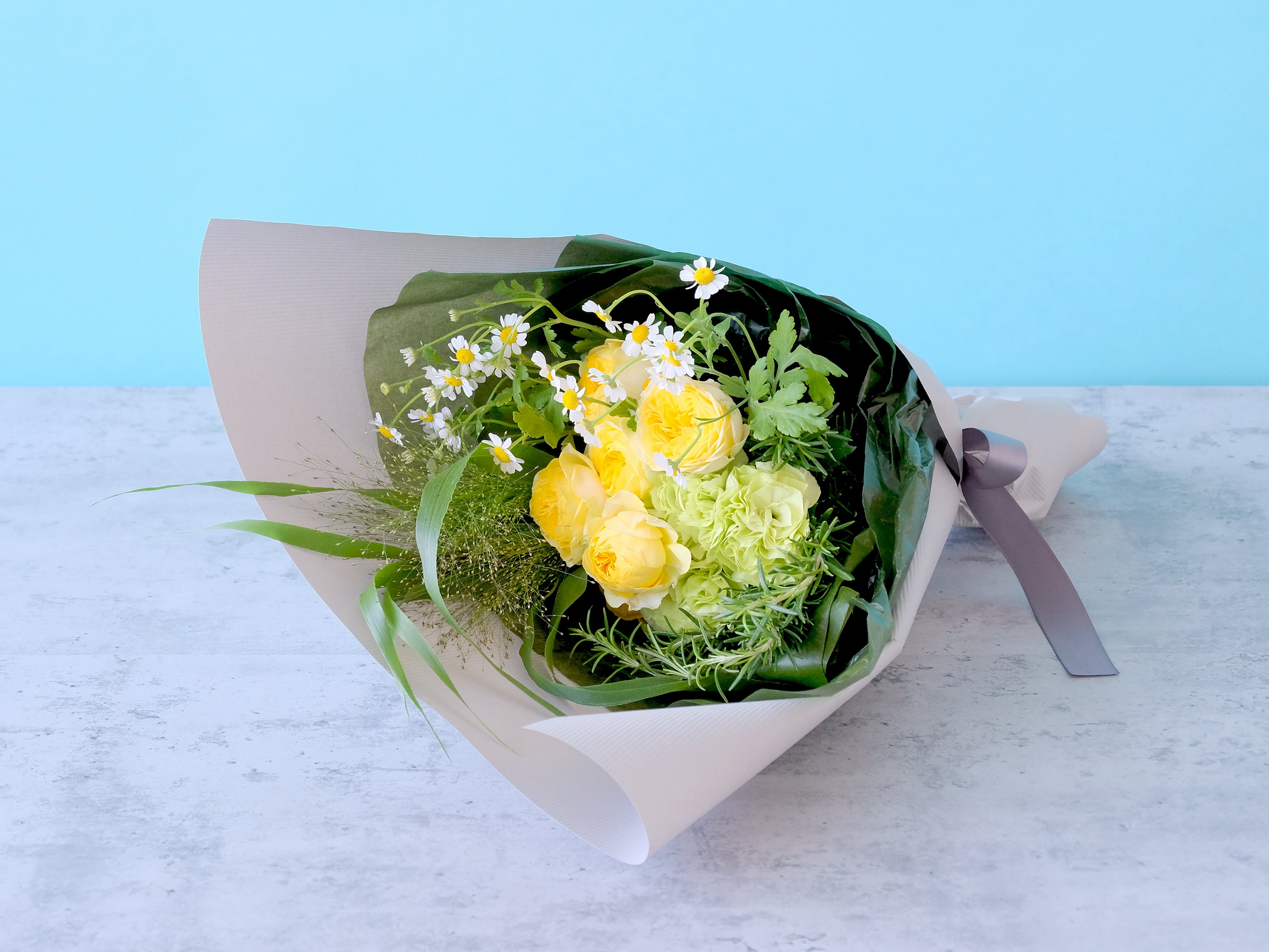 父の日に人気の黄色のバラを中心に花々とリーフを合わせた、ナチュラルなブーケです。バラの色は黄色以外にもお好みにあわせてお選びいただけます。