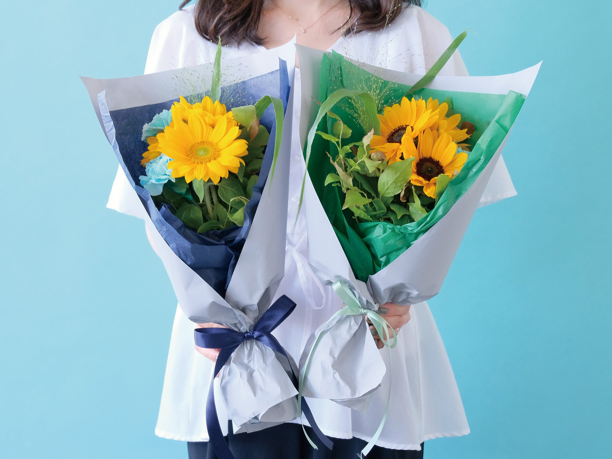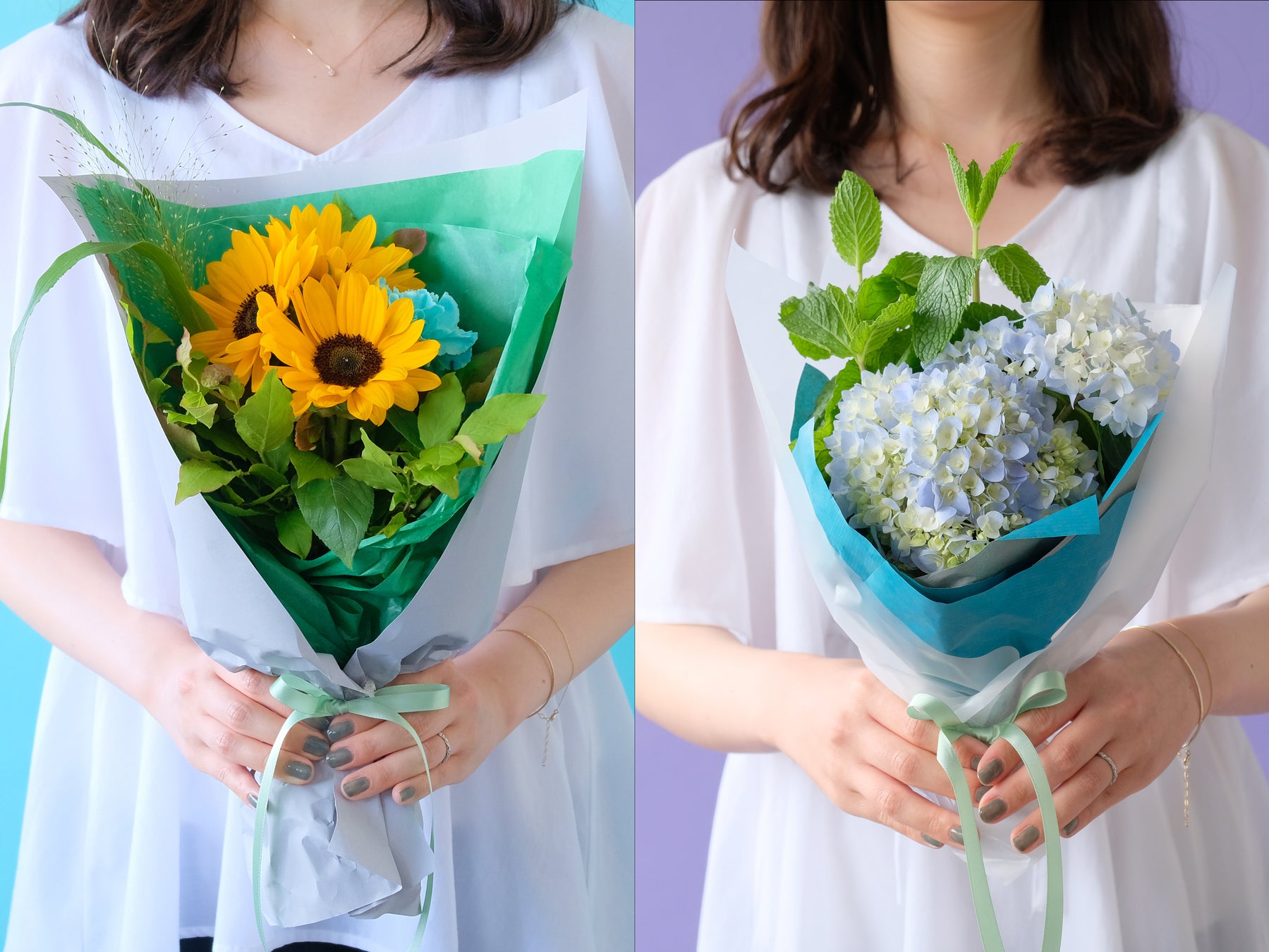 父の日の花として人気のヒマワリには青空をイメージした水色の花やリーフ類を合わせて、ナチュラルでフレッシュなデザインにしました。また、6月の季節感を楽しめるアジサイは、この季節ならではのおすすめの花です。香りのよいハーブを合わせて、みずみずしい雰囲気に仕上げました。どちらも初夏の雰囲気たっぷりの花ですので、父の日はもちろん、お誕生日やご自分への贈り物として、ヒマワリやアジサイをさまざまなスタイルでお楽しみくださいませ!