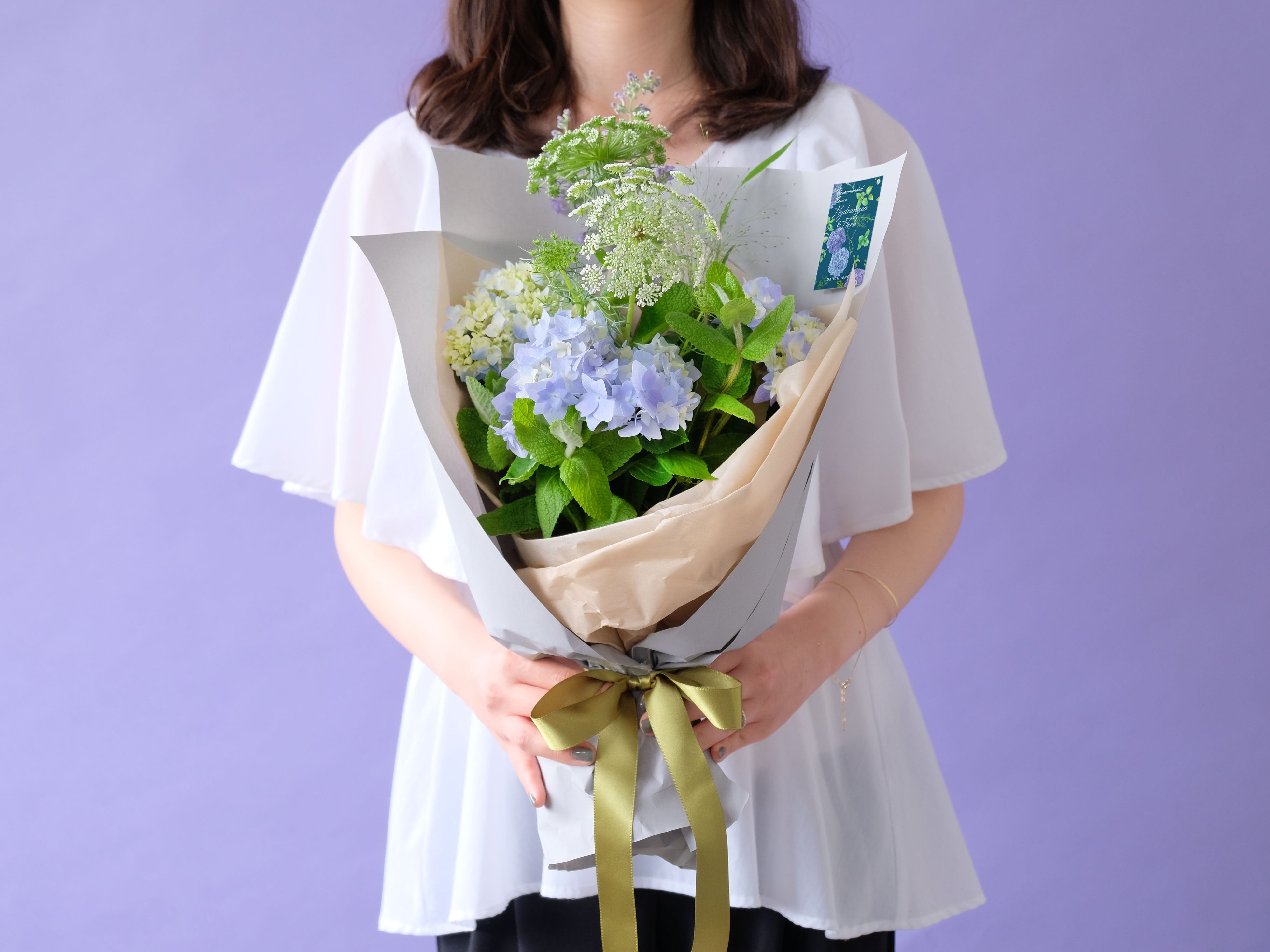 大ぶりなアジサイにナチュラルな小花とハーブを組み合わせました。初夏を感じるクリーンな雰囲気のブーケです。父の日のプレゼントにも、性別を問わない贈り物にもおすすめです。
