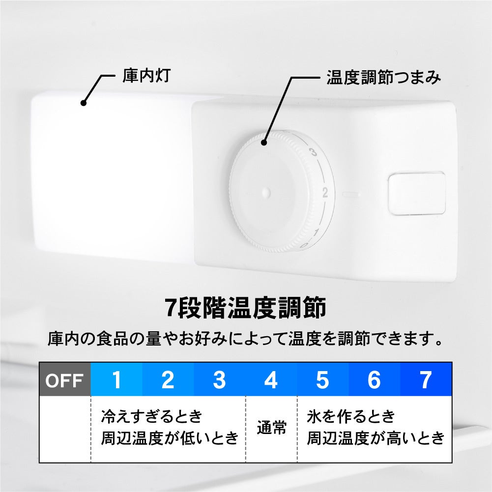 温度調整はつまみによるダイヤル式で、どなたでも簡単に、直観的に操作をすることができます。7段階の調節が可能で、冷蔵庫の周辺温度が変化したときや氷を作るとき等、状況に合わせた温度調整が可能です。また、ダイヤルの横についている庫内灯は、冷蔵室のドアを開けると自動で点灯するので、温度調整つまみや食品が見やすく、すぐに見つけることができます。