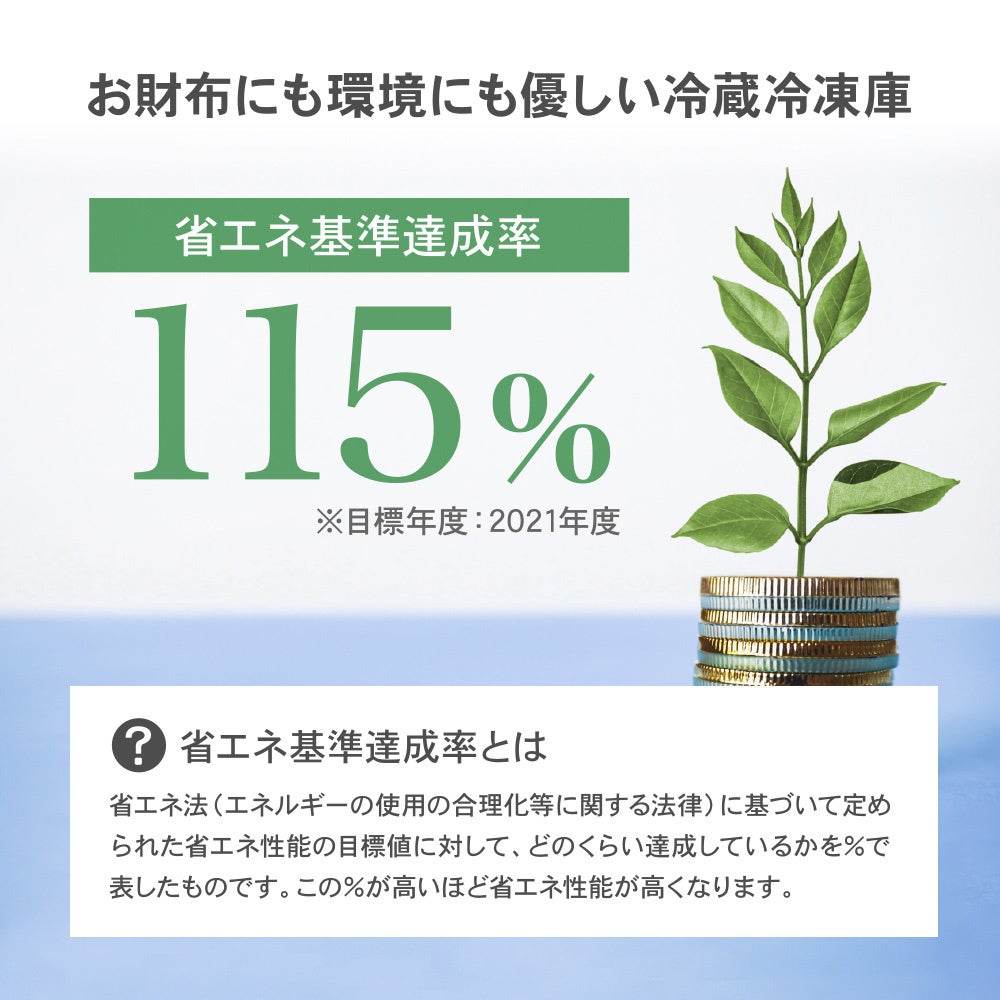 本製品は省エネ法によって定められた省エネ基準達成率において、115%を達成しています。この数値が高いほど製品の省エネ性能は高くなりますので、電気代の節約や、近年注目されているSDGs(持続可能な開発目標)に貢献することが期待できます。