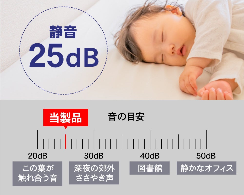 運転⾳はとても静かで約26db程度です。⼀⼈暮らしの⽅のお部屋や個室などの限られた空間、赤ちゃんや小さなお子様がいらっしゃるご家庭でも安心してお使いいただけます。