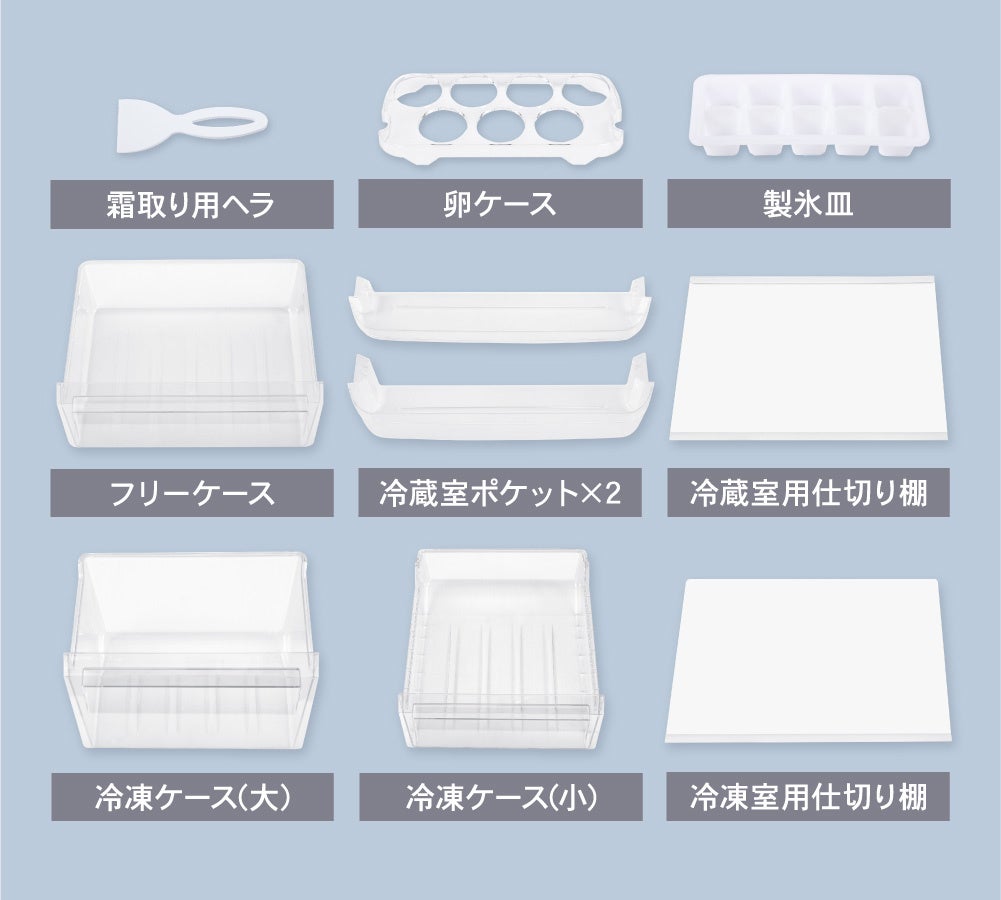 冷凍室は収納が3段となっており、上段のトレーには調理時間の短縮の為に急冷する料理を、中段のクリアケースには作り置きおかずや話題の冷凍宅配弁当などの冷凍食品を、下段の大きめのクリアケースにはアイスの箱など収納する等、食品によって使い分けることができます。また、冷却性能はJIS規格最高水準のフォースターマークが付与されております。なお、同梱品は製氷皿、霜取り用ヘラと必要なものが揃っており、買い足す必要はございません。