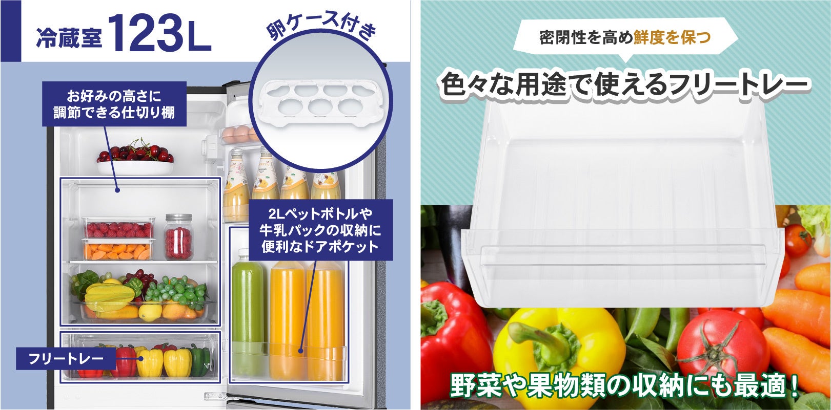 お好みの高さ調節ができる仕切り棚、透明で中が見やすいフリートレー、3段あるドアポケット、卵ケースといった、冷蔵庫の定番装備を欠かさず揃えています。特にフリートレーは、密閉性を高め鮮度を保つことができるので、かさばってスペースを取りがちな野菜や果物を整理整頓して保存するのにとても便利な装備です。