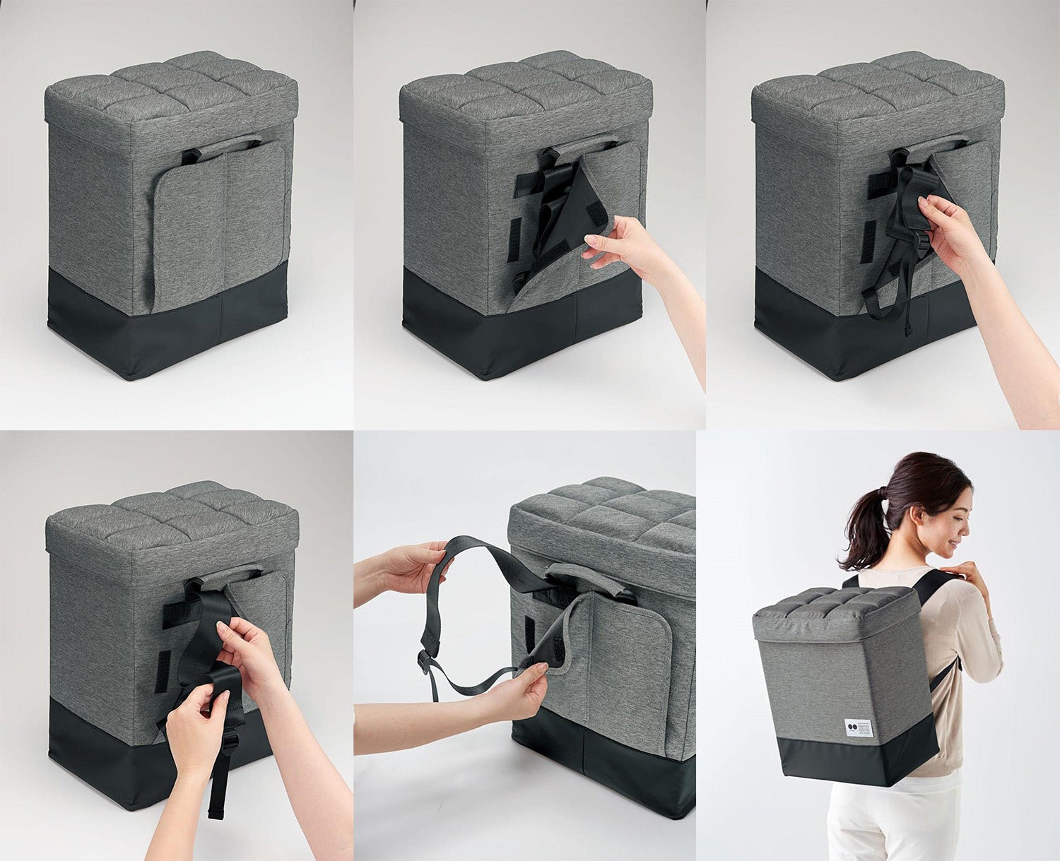 - 普段は玄関チェアとして、災害時にはリュックに変身する2WAY仕様。