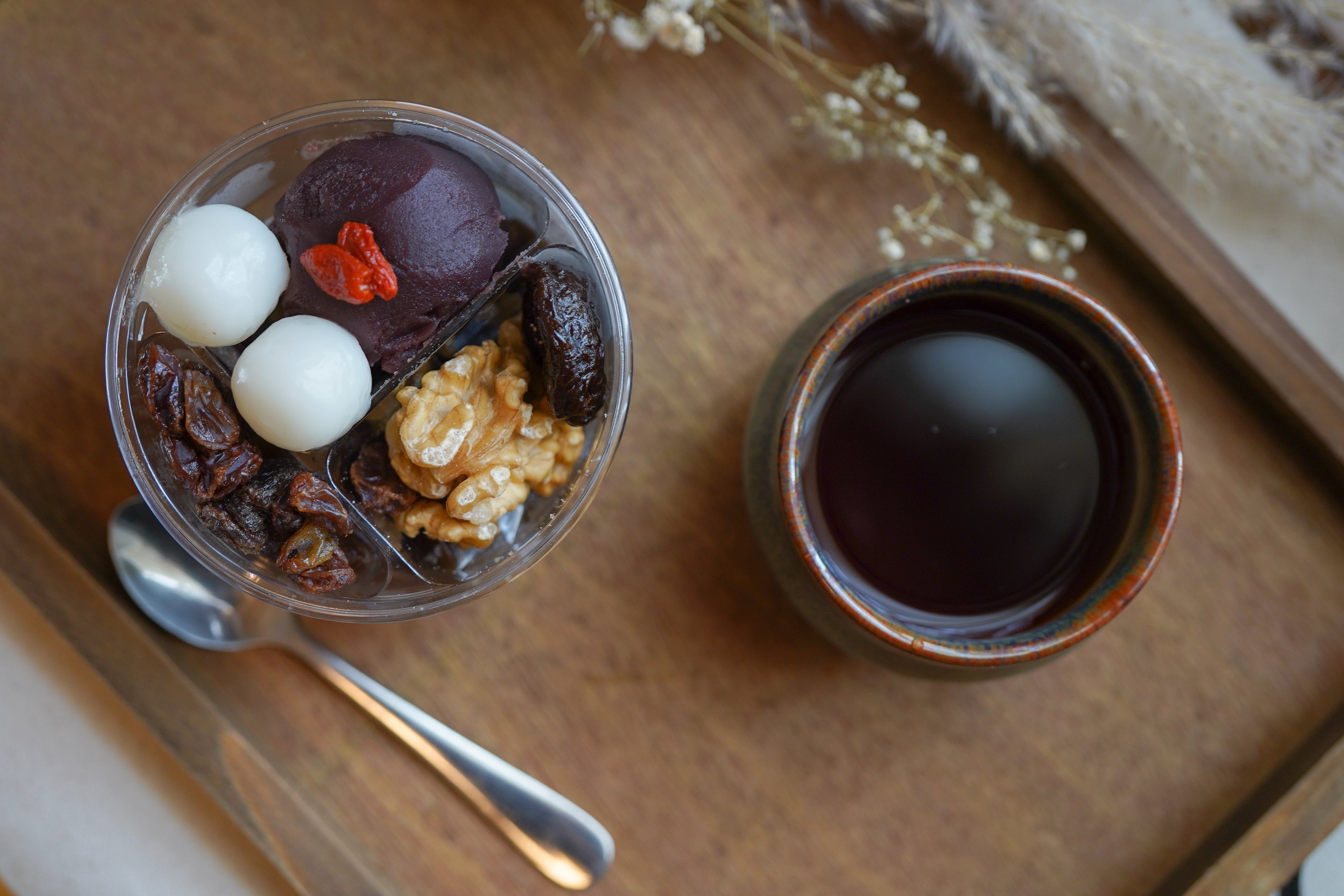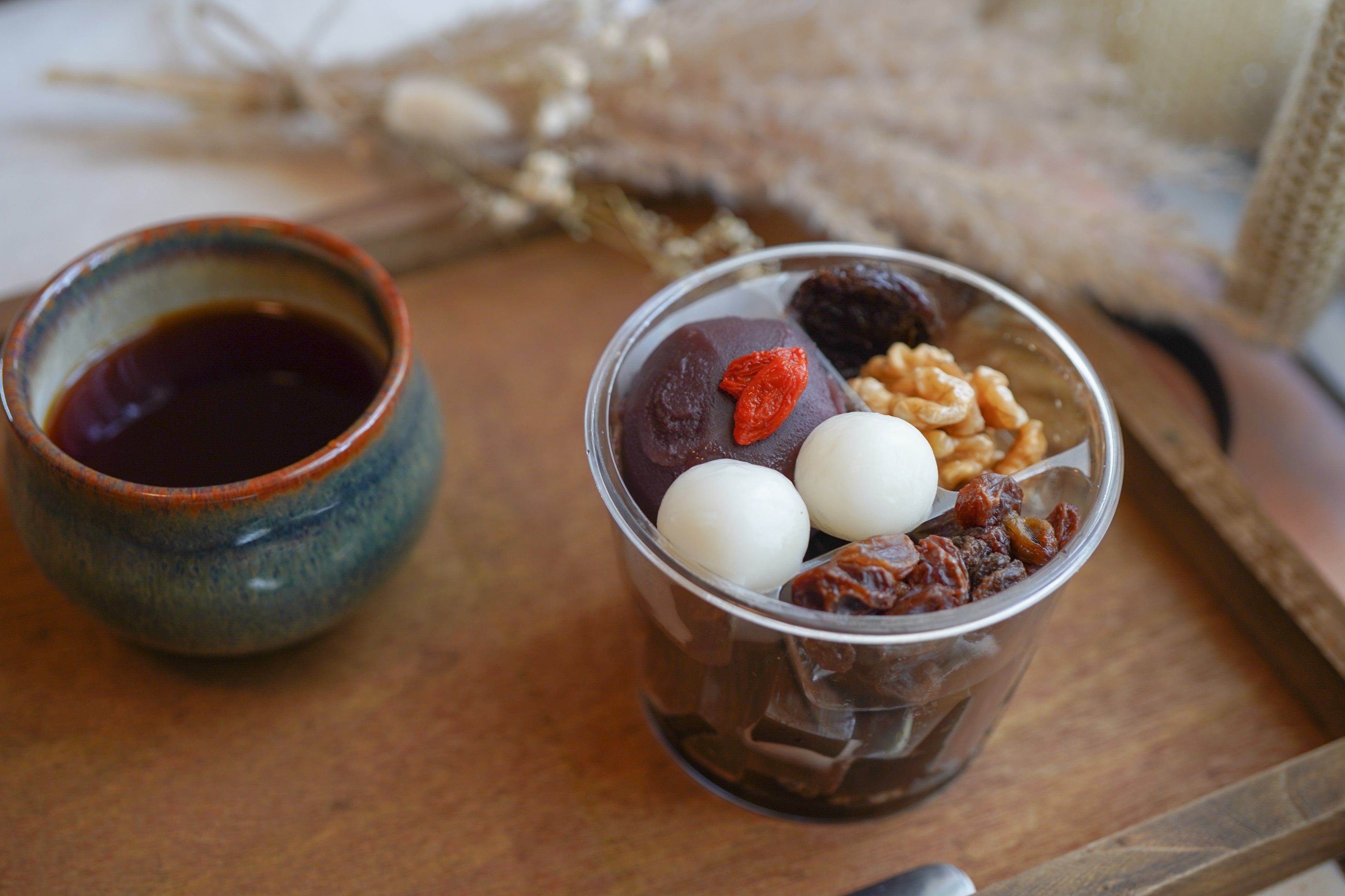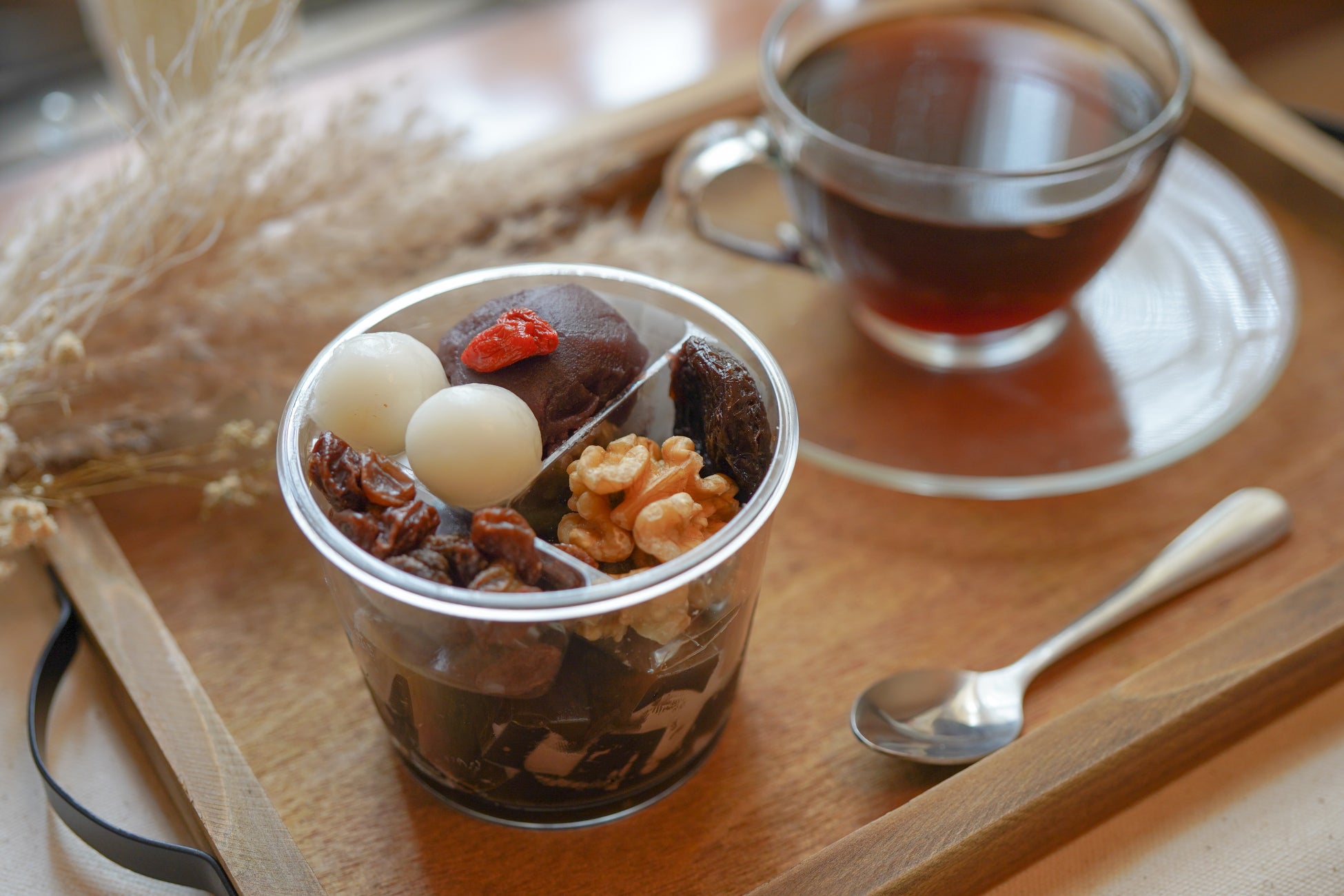 ほろ苦い珈琲寒天に船橋屋特製の甘い黒蜜が絶妙にマッチ。レーズンやくるみ、プルーンを合わせることで上品且つ大人なあんみつに仕上げました。他では味わえない餡子と珈琲の組み合わせにも注目していただきたい一品です。
