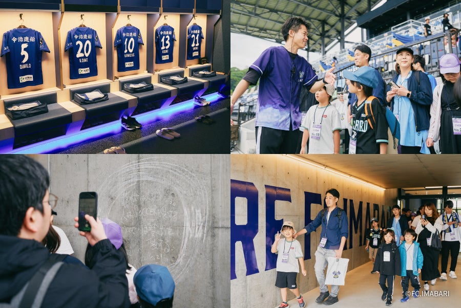 試合前に行われたスタジアムツアーでは、選手ロッカールーム、スイートルーム、ピッチなど、普段訪れることのできないエリアを回りました。スタジアムの各所に船や海をモチーフとした意匠が施されていること、海事関係のスポンサー企業が多いことなど、造船の街ならではのこだわりや経緯を知り、よりFC今治への理解が深まった様子でした。