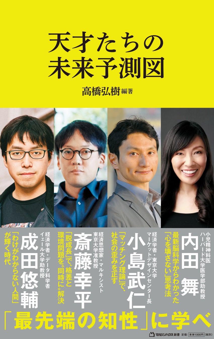株式会社マガジンハウス(本社:東京都中央区、代表取締役社長:片桐隆雄)は、成田悠輔氏、斎藤幸平氏、小島武仁氏、内田舞氏の新刊『天才たちの未来予測図』を全国書店・インターネット書店にて2022年9月29日(水)に発売いたします。