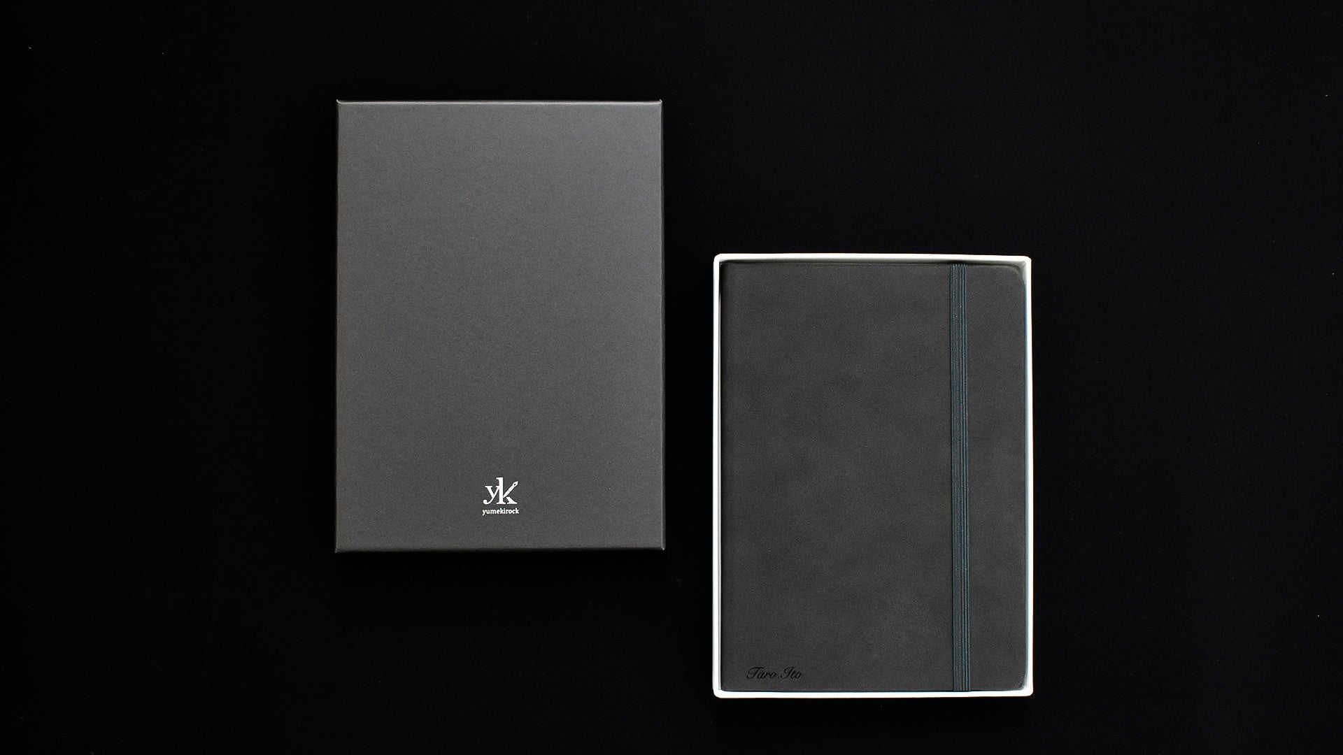 仕様: 厚口用紙、ノンブル入り、糸かがり綴じ、マットPU表紙、同色ゴムバンド、特注ギフト箱入り