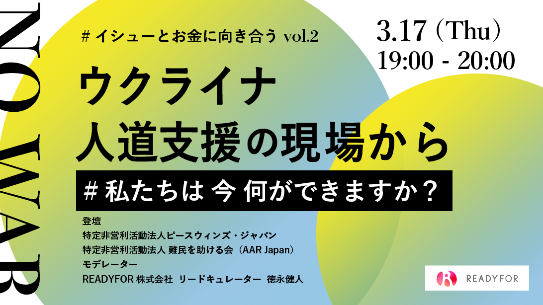 日本初・国内最大級のクラウドファンディングサービス「READYFOR」を運営するREADYFOR株式会社は、2022年3月17日(木)にウェビナー「ウクライナ人道支援の現場から #私たちは今何ができますか? 〜イシューとお金に向き合う vol.2〜」を開催いたします。
