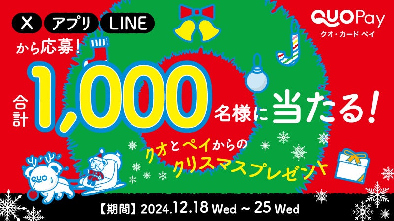 株式会社クオカード(以下当社、本社:東京都中央区、代表取締役社長:近田 剛)が展開するスマートフォンで使えるデジタルギフト「QUOカードPay(クオ・カード ペイ)」は、12月18日(水)より「クオとペイからのクリスマスプレゼント」キャンペーンを実施します。本キャンペーンはQUOカードPayの公式X・アプリ・LINEで同時開催し、期間中合計1,000名様に最大12,000円分のQUOカードPayが当たります。