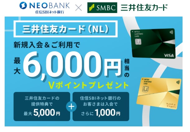 また、住信SBIネット銀行から、「一般のお客さま向け」クレジットカード(本ページの下部に記載)にお申込み・ご入会いただいた方には、三井住友カードが特典として進呈するVポイントに、さらに追加でVポイントを進呈いたします。
