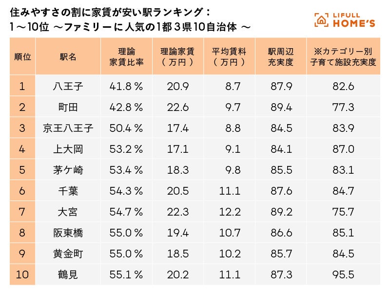 そこで「LIFULL HOME'S PRESS」では夏休み前に、2021年の住民基本台帳人口移動報告による0~14歳の転入超過者数上位10自治体(埼玉県さいたま市、千葉県千葉市、東京都町田市、千葉県流山市、千葉県柏市、神奈川県藤沢市、千葉県印西市、神奈川県横浜市、神奈川県茅ヶ崎市、東京都八王子市)のなかで、多くのファミリーが重視する住まい探しのポイントを「家賃」と「駅周辺の充実度」と仮定し、実際に住むなら具体的にどの駅が住みやすく、コスパが良いのか?を検証するため、不動産・住宅情報サイト「LIFULL HOME'S」の独自データ(※3)をもとに、【住みやすさの割に家賃が安い駅ランキング】調査を実施しました。