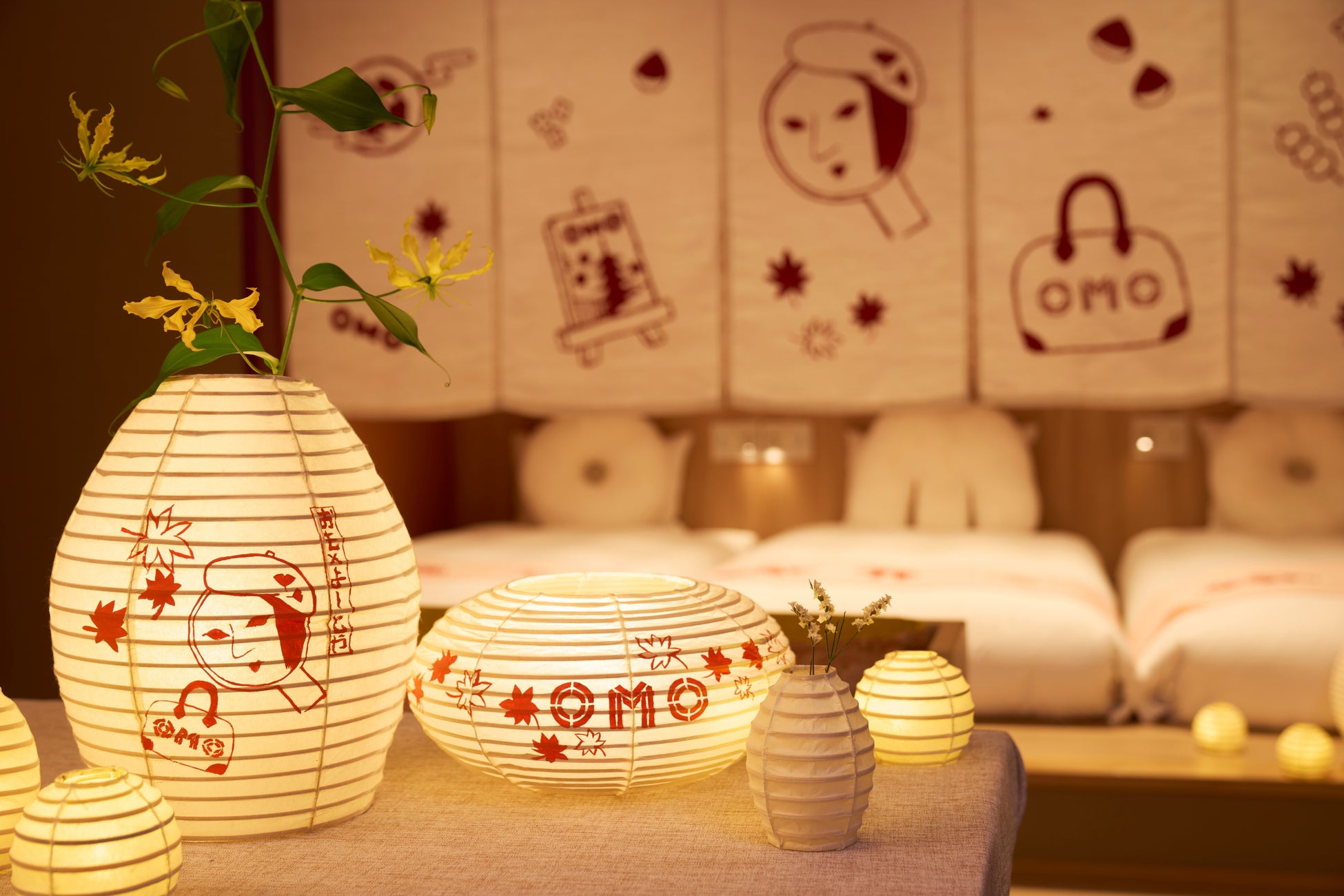 江戸時代から変わらぬ製法で提灯を作り続ける老舗「小嶋商店」のプロデュースのもと、花を生けながら明かりを点けられる「花瓶提灯」や、従来の提灯の形とは異なる遊び心あふれる形の提灯で客室をライトアップします。日中に紅葉散策を楽しんだ後は、プライベート空間でも紅葉ライトアップが楽しめます。また、客室の中心にかかる手染めののれんは、京都の秋を連想させるイラストを散りばめて秋仕様に変身します。