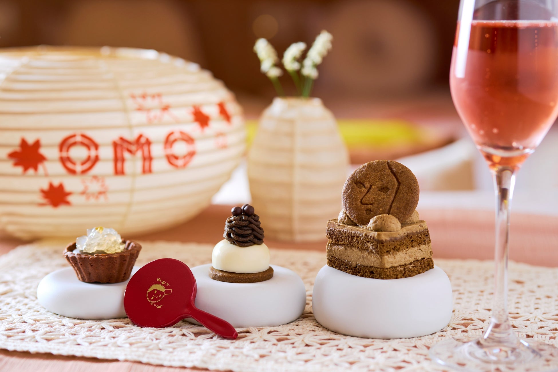 京都市内に展開する「よーじやカフェ」のパティシエが本プランのためにオリジナルで考案した、よーじやカフェ初の「ほうじ茶スイーツ」を客室にて提供します。ほうじ茶餡を使用したモンブランや、ほうじ茶生チョコと桃のゼリーを合わせたタルト、ほうじ茶ケーキの3種を用意しました。甘さ控えめなスイーツに、あえて少し甘さのあるロゼスパークリングワインを、ソムリエの選定により合わせました。夜の身支度を終えた後は、大人のスイーツセットとともに、提灯ライトアップを楽しむことで秋の夜長を満喫できます。