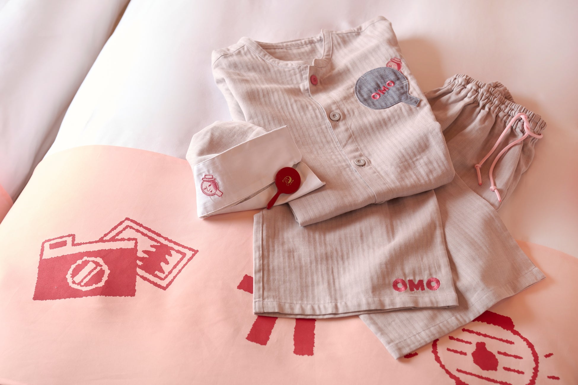 パジャマのワンポイントには、よーじやの象徴である手鏡がポケットとしてあしらわれ、袖をめくるとOMOとよーじやのロゴが。パジャマには遊び心が散りばめられ、隠れOMOロゴやよーじやロゴを探すのも楽しみの一つです。着用した際のシルエットにもこだわり、オーバーサイズな設定にしました。お揃いのパジャマを着て、客室と写真撮影を楽しんだり、ベッドで寛いだりと、友人や家族と思い思いの時間を過ごせます。
